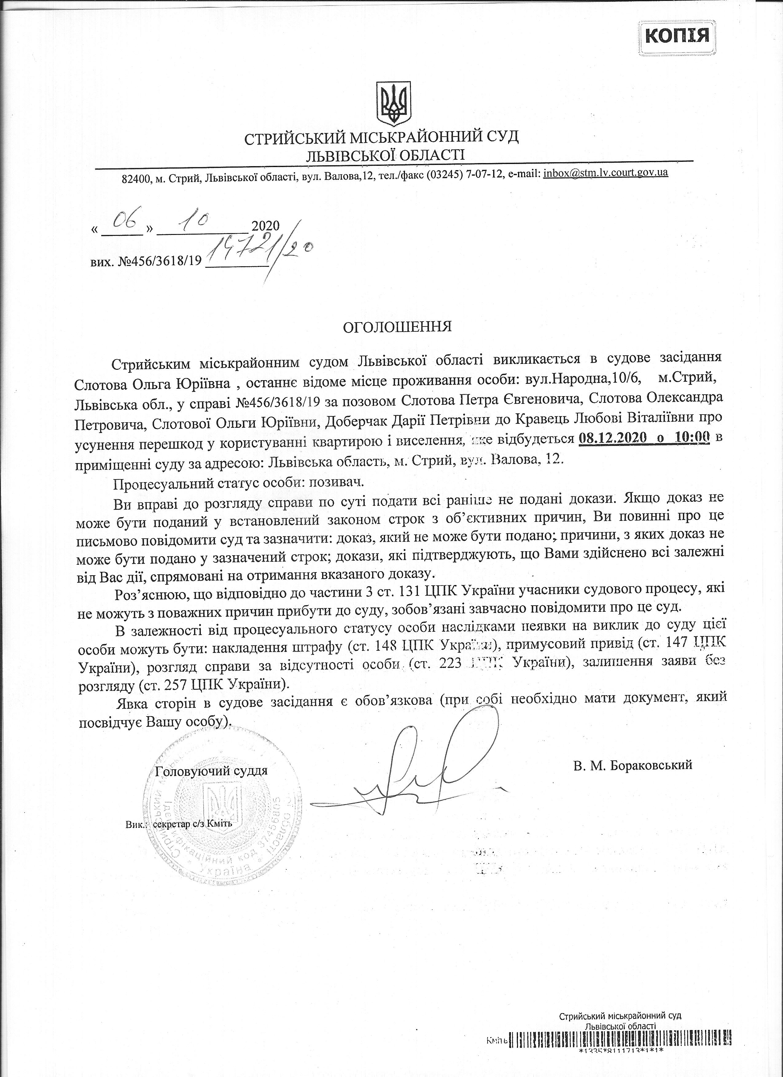 Про виклик Слотової О.Ю.