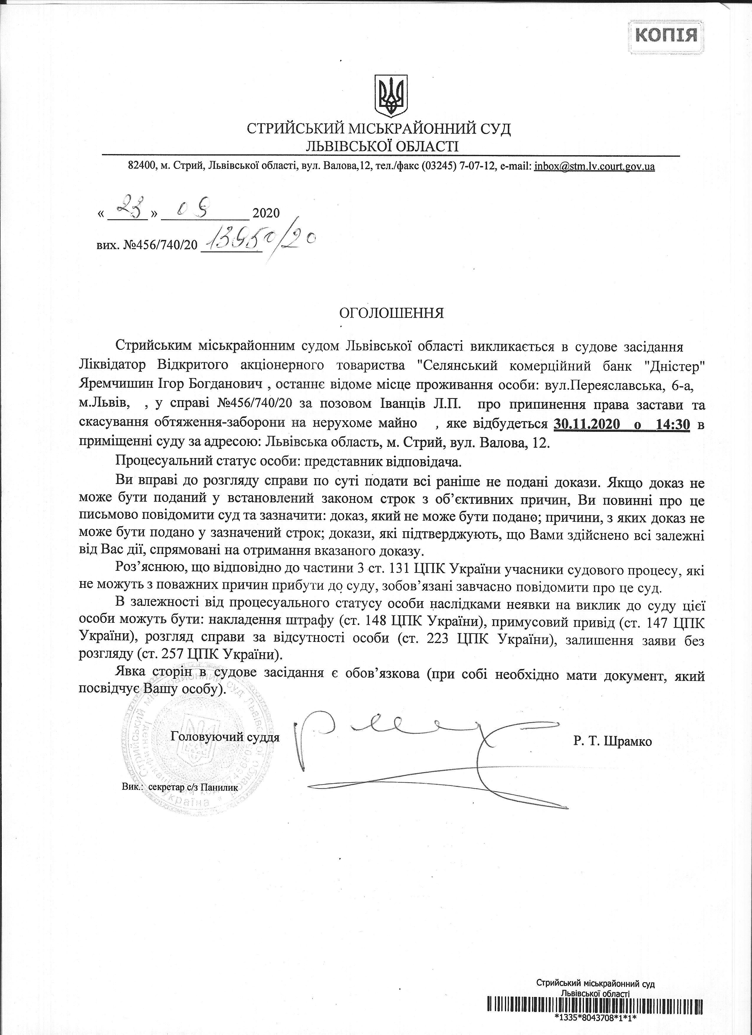 Про виклик Ліквідатор Відкритого акціонерного товариства "Селянський комерційний банк "Дністер"