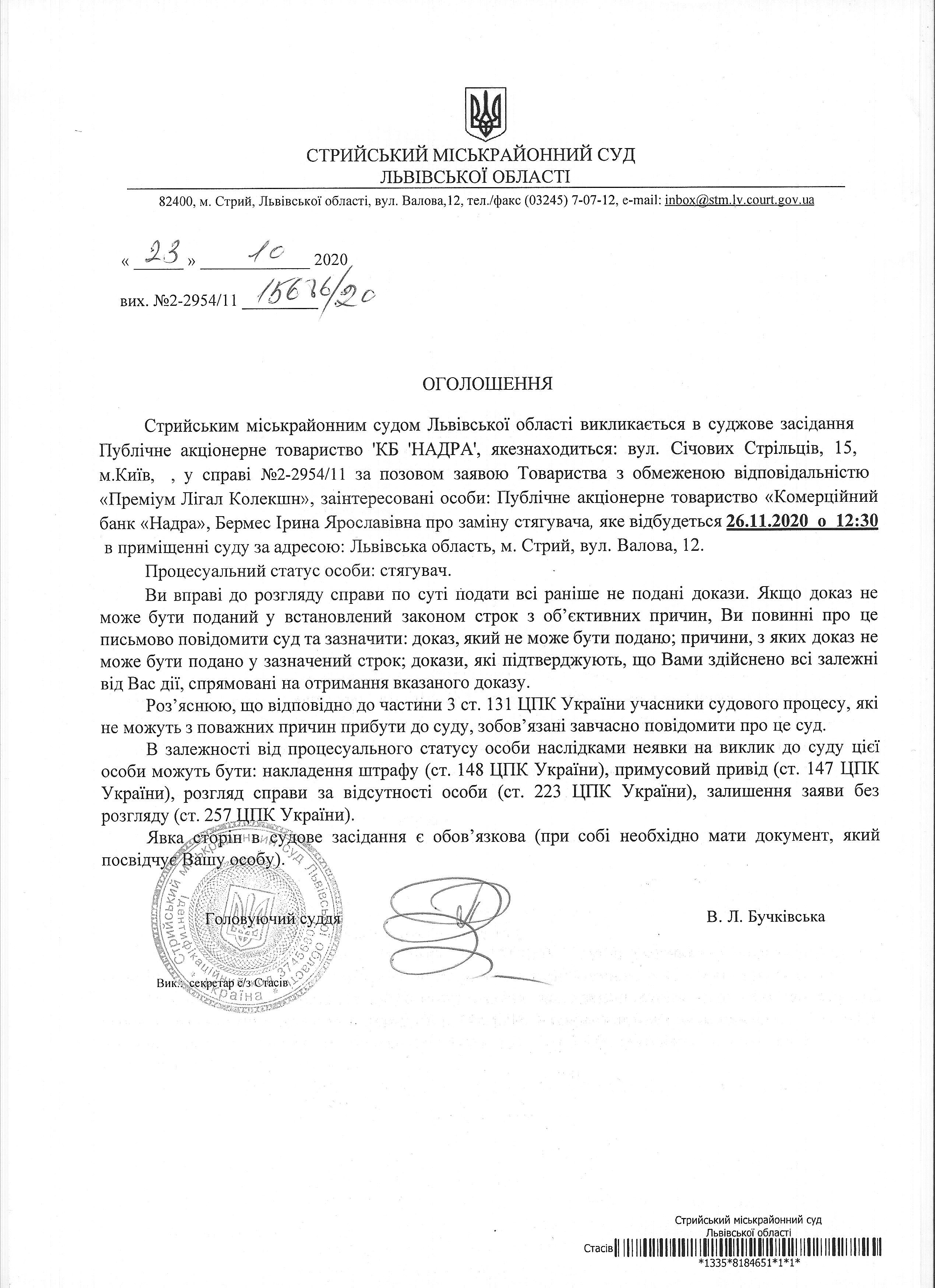 Про виклик ПАТ "КБ"НАДРА"