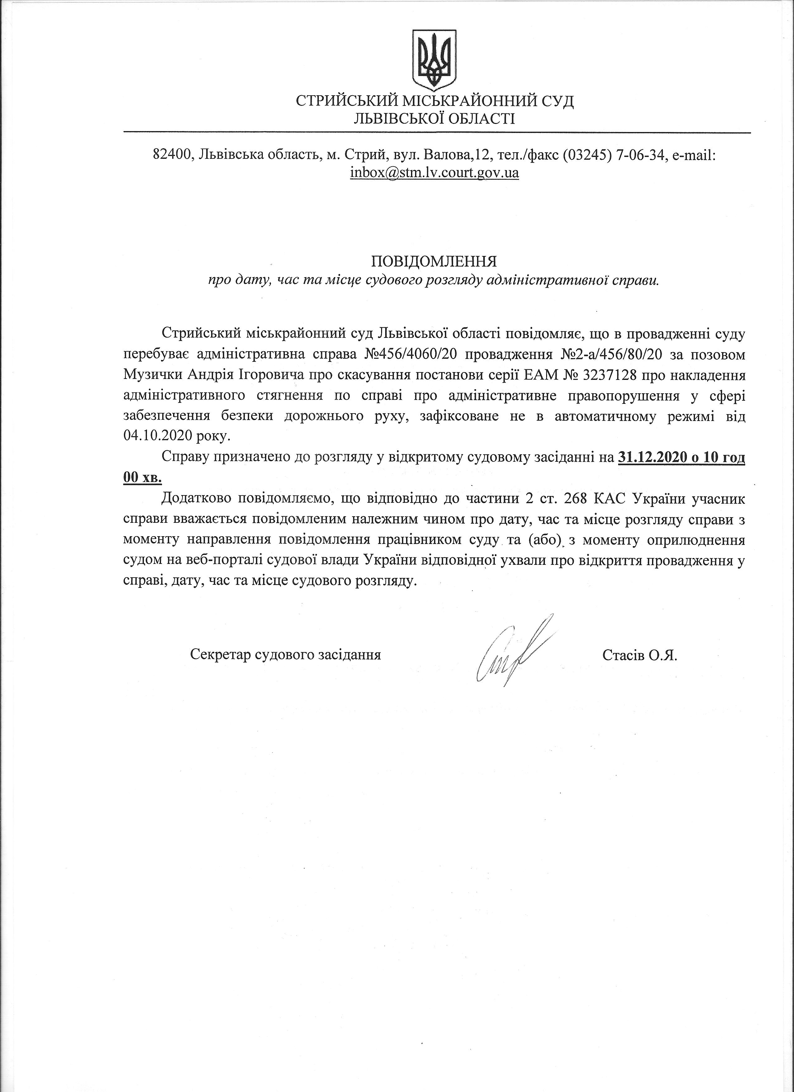 Повідомлення про дату, час та місце судового розгляду адміністративної справи
