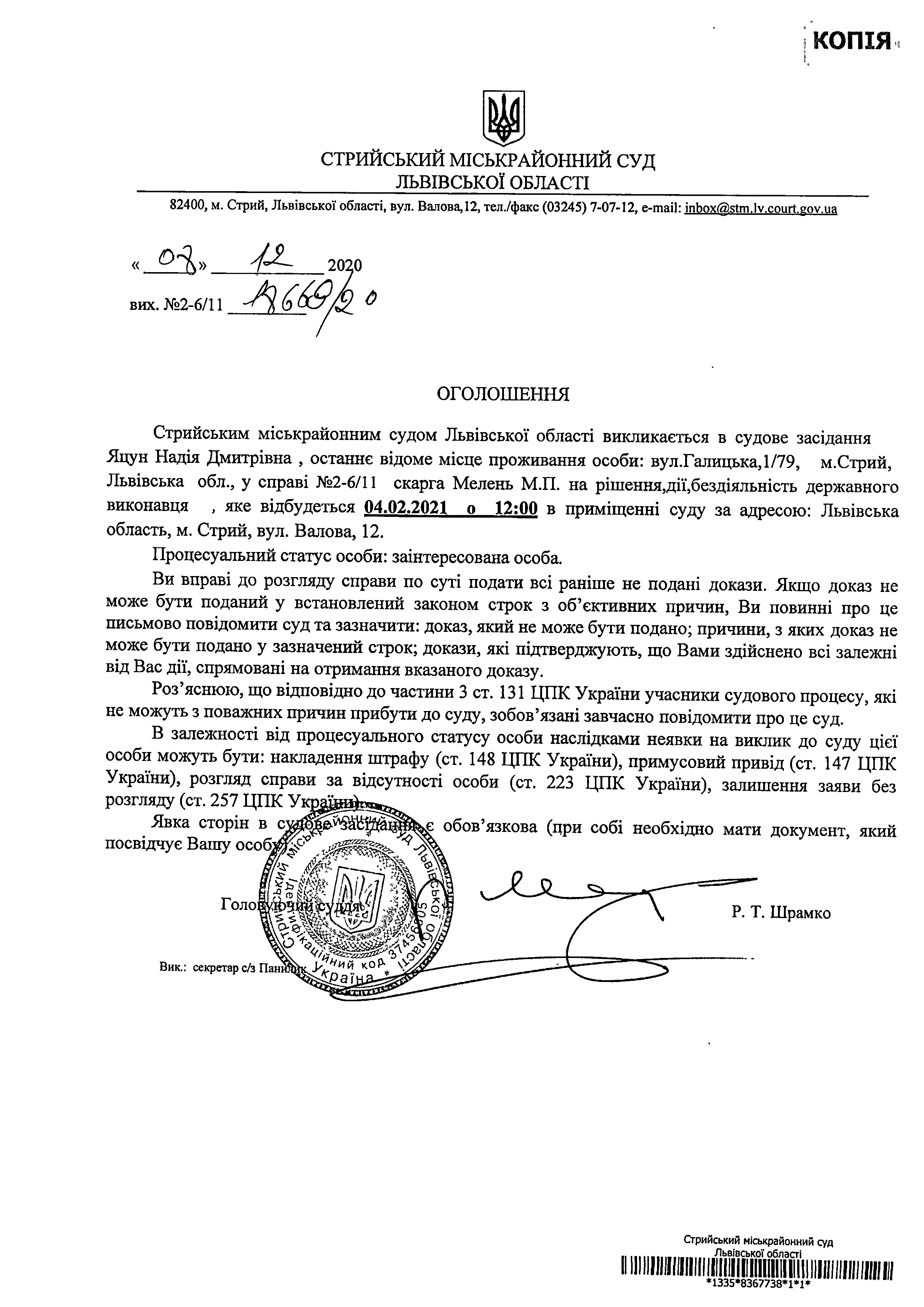 Про виклик Яцун Н.Д..