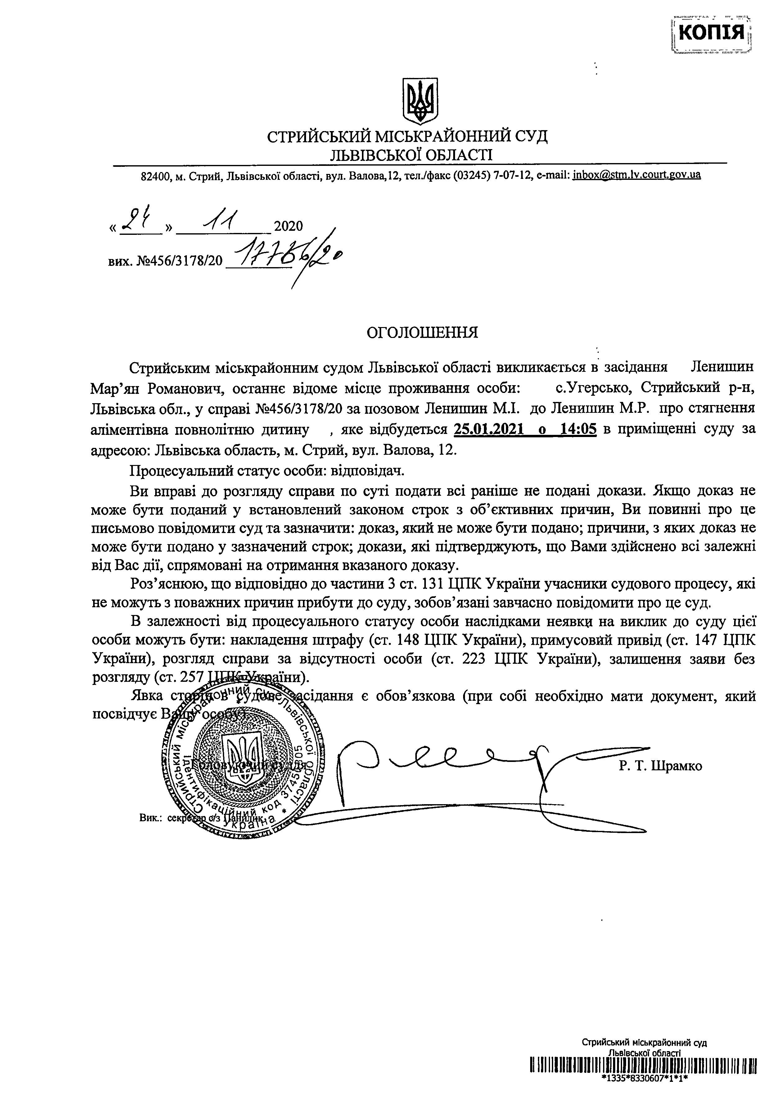 Про виклик Ленишин М.Р.