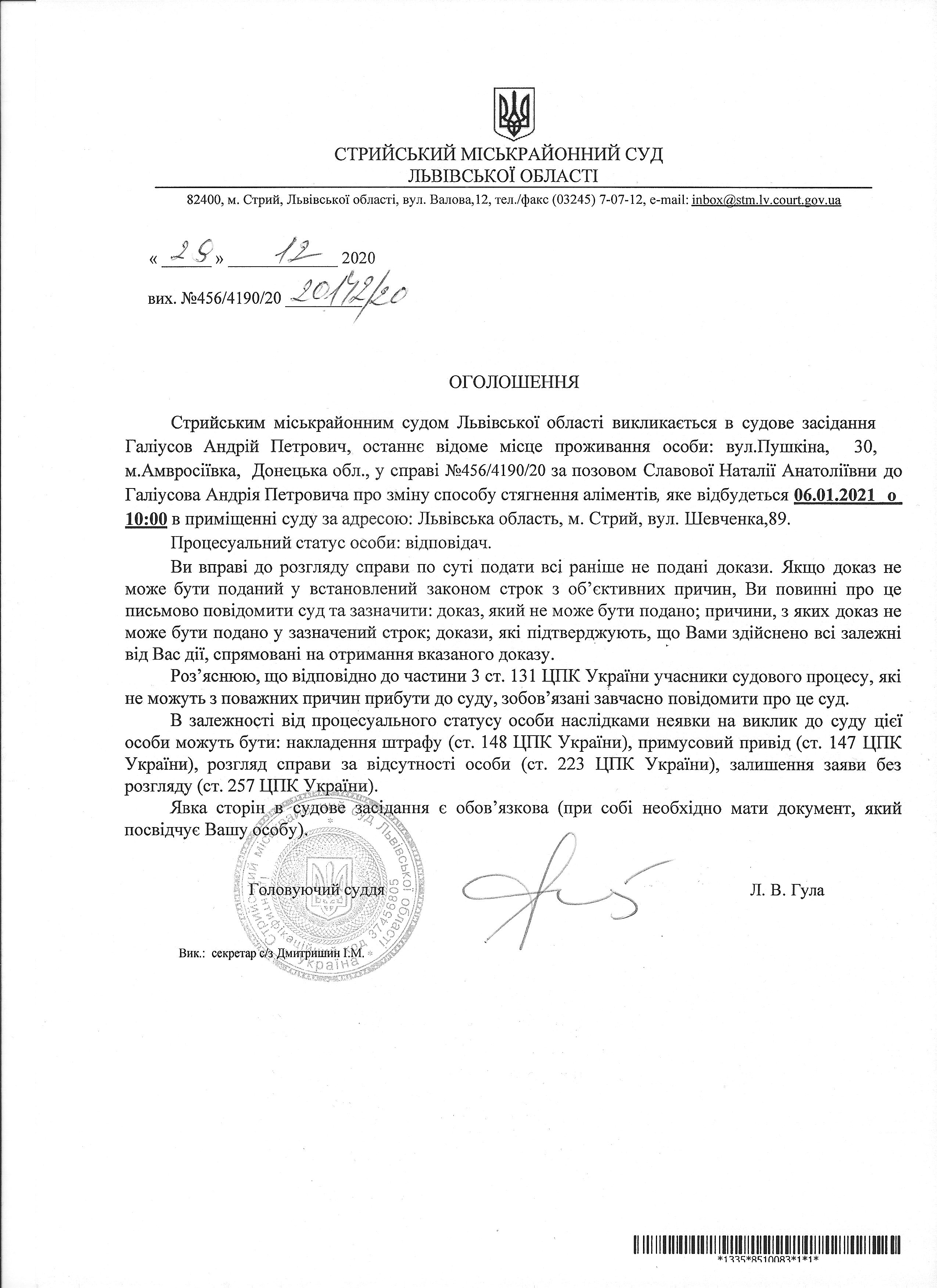 Про виклик Галіусов А.П.
