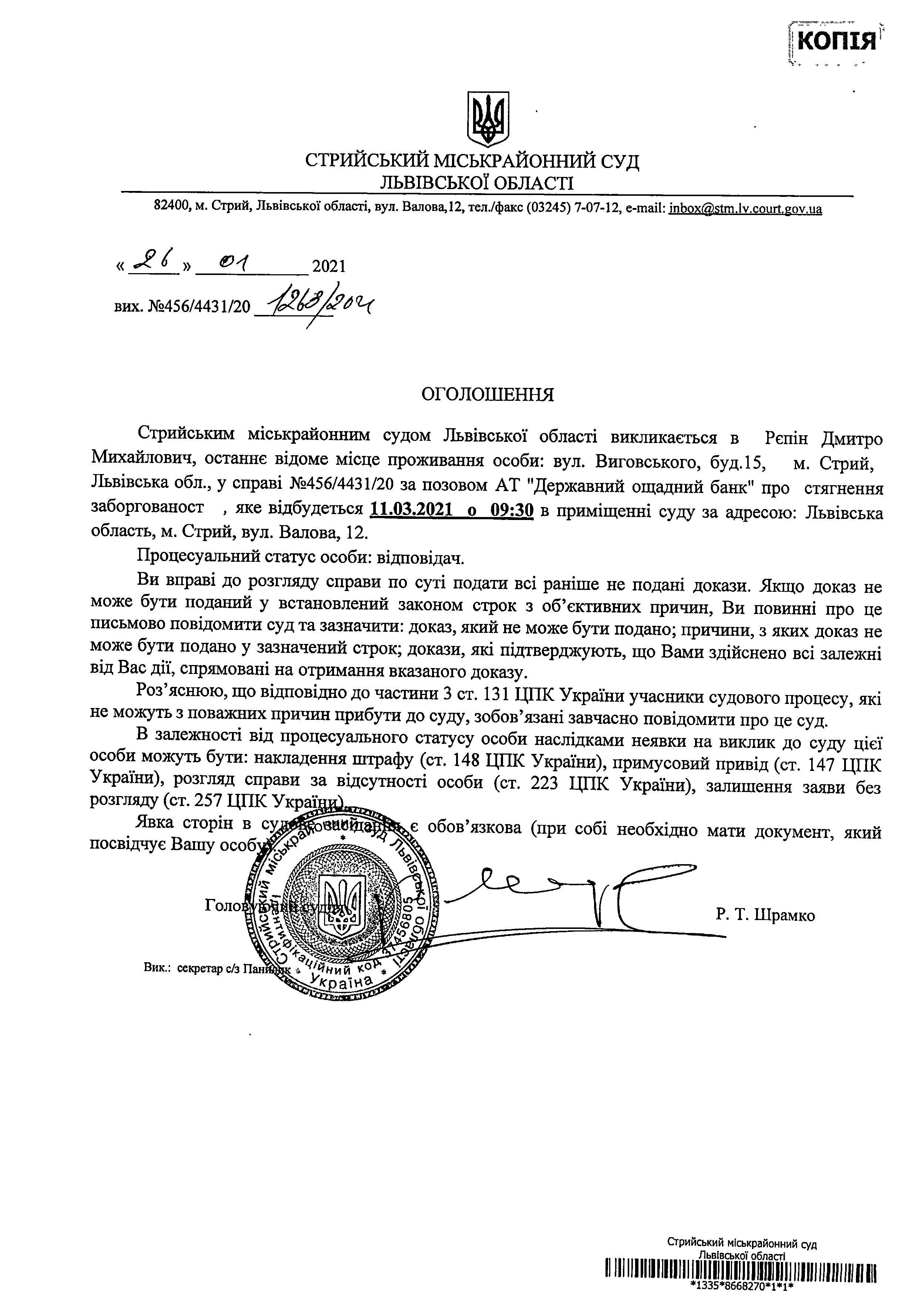 Про виклик Рєпін Д.М.