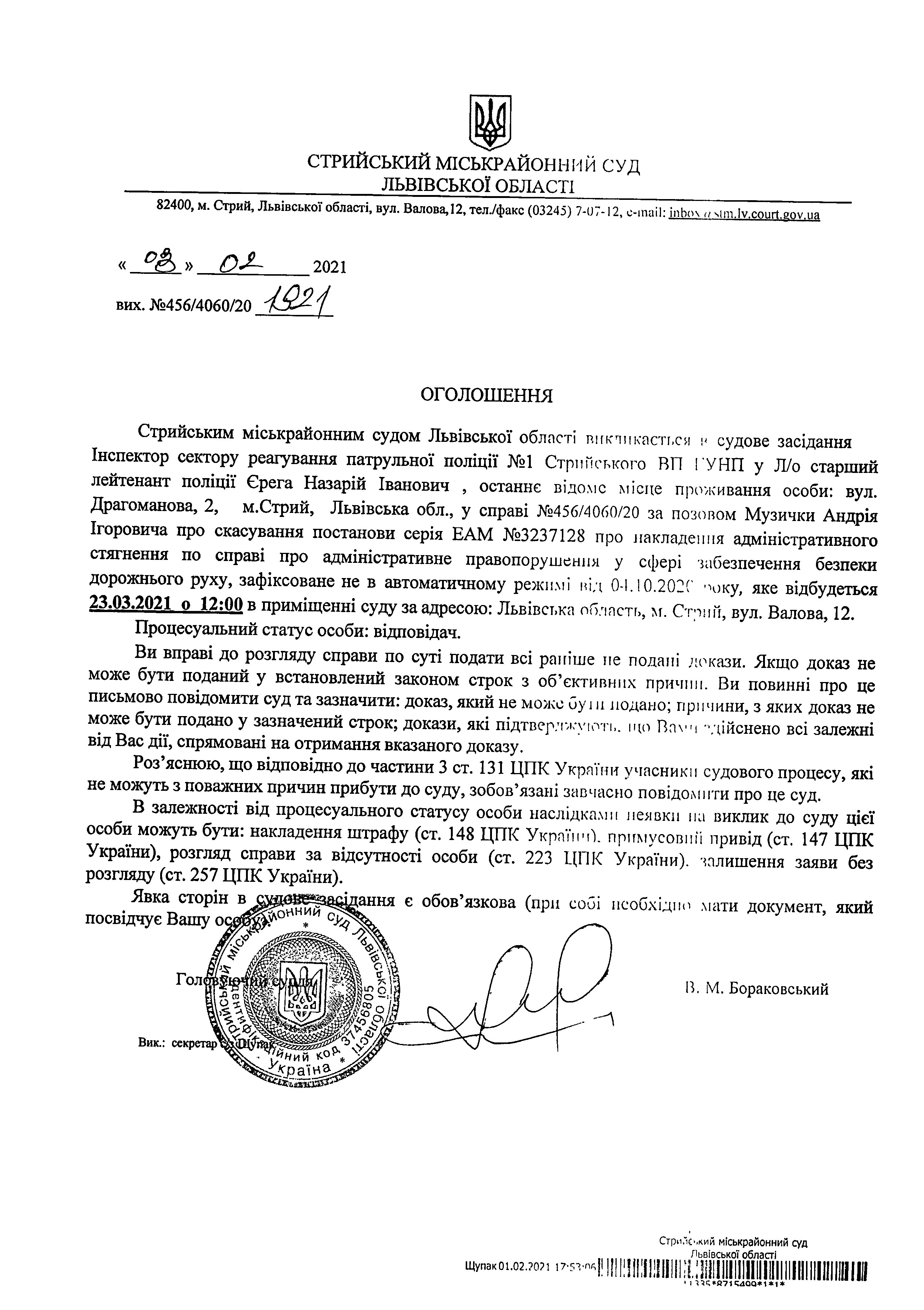 Про виклик Інспектора сектору реагування патрульної поліції №1 Стрийського ВП ГУНП у Л/о старшого лейтенанта поліції Єрегу Н.І.