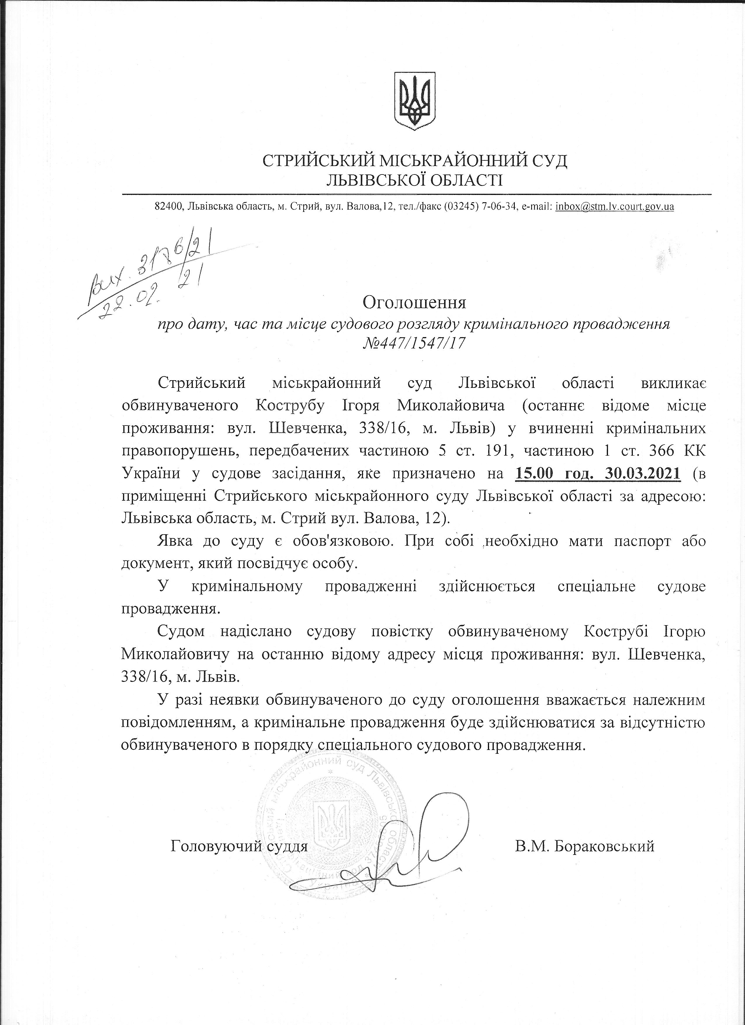 Оголошення про дату, час та місце судового розгляду кримінального провадження