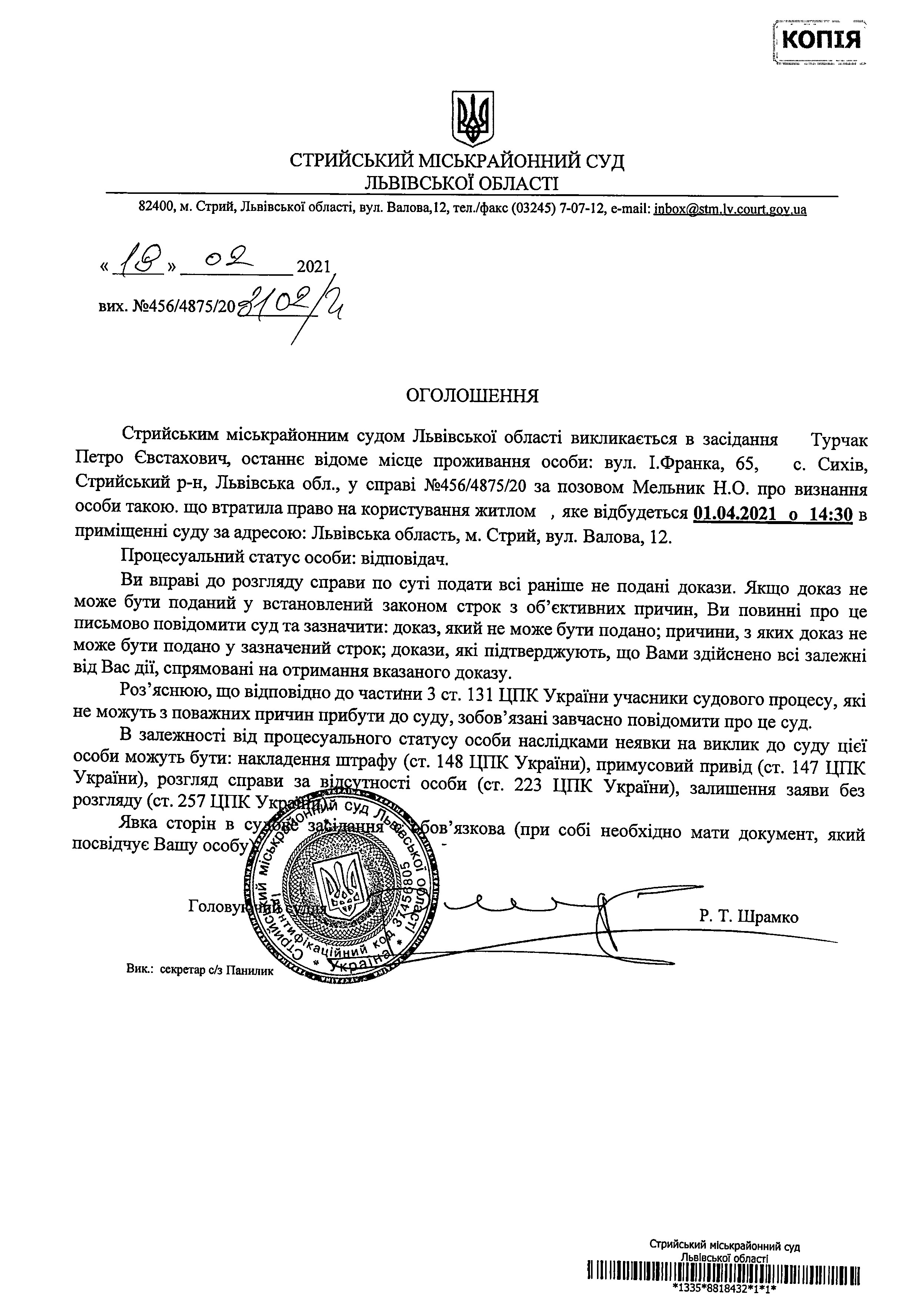 Про виклик Турчак П.Є.