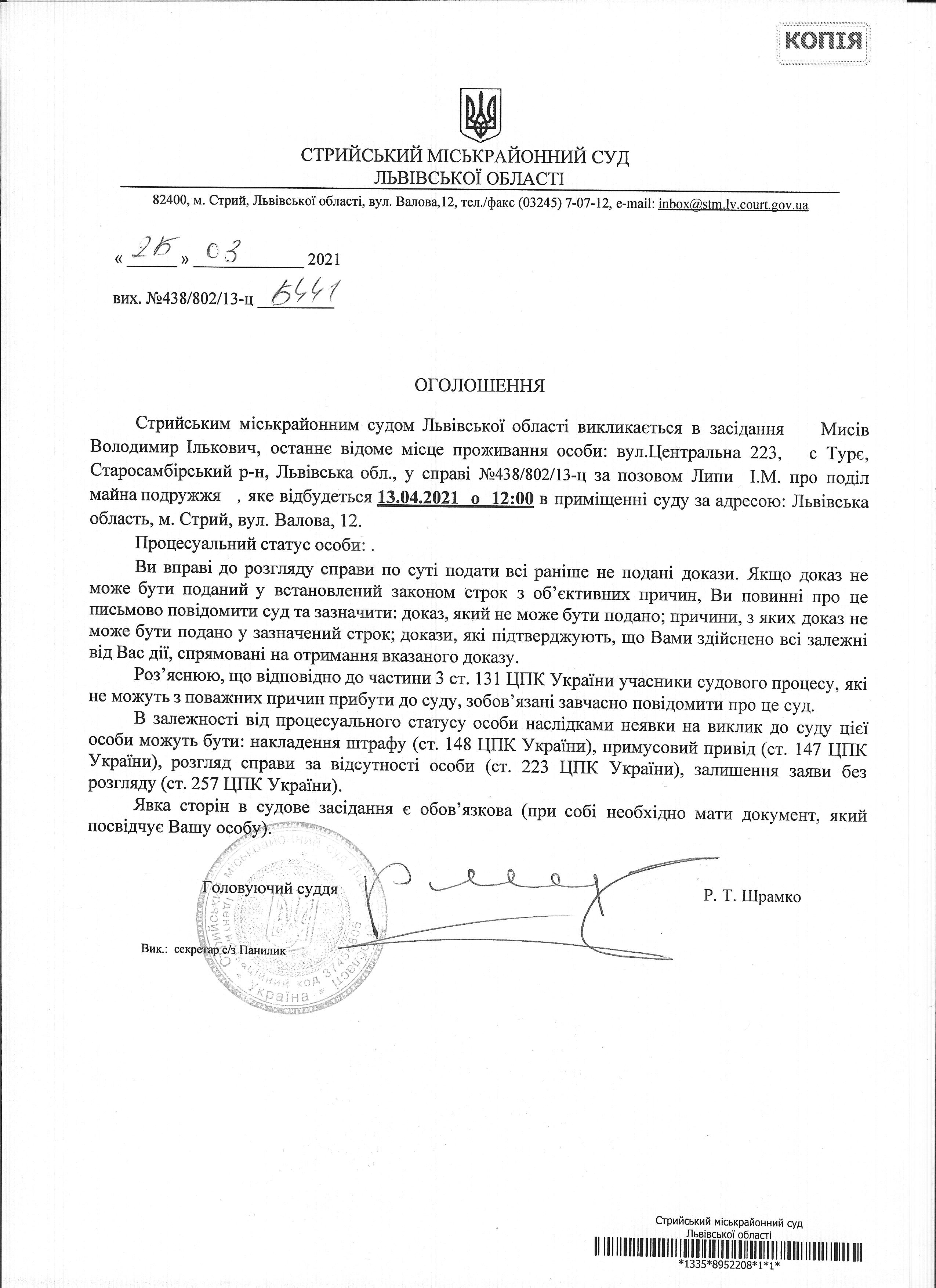 Про виклик Мисів В.І.