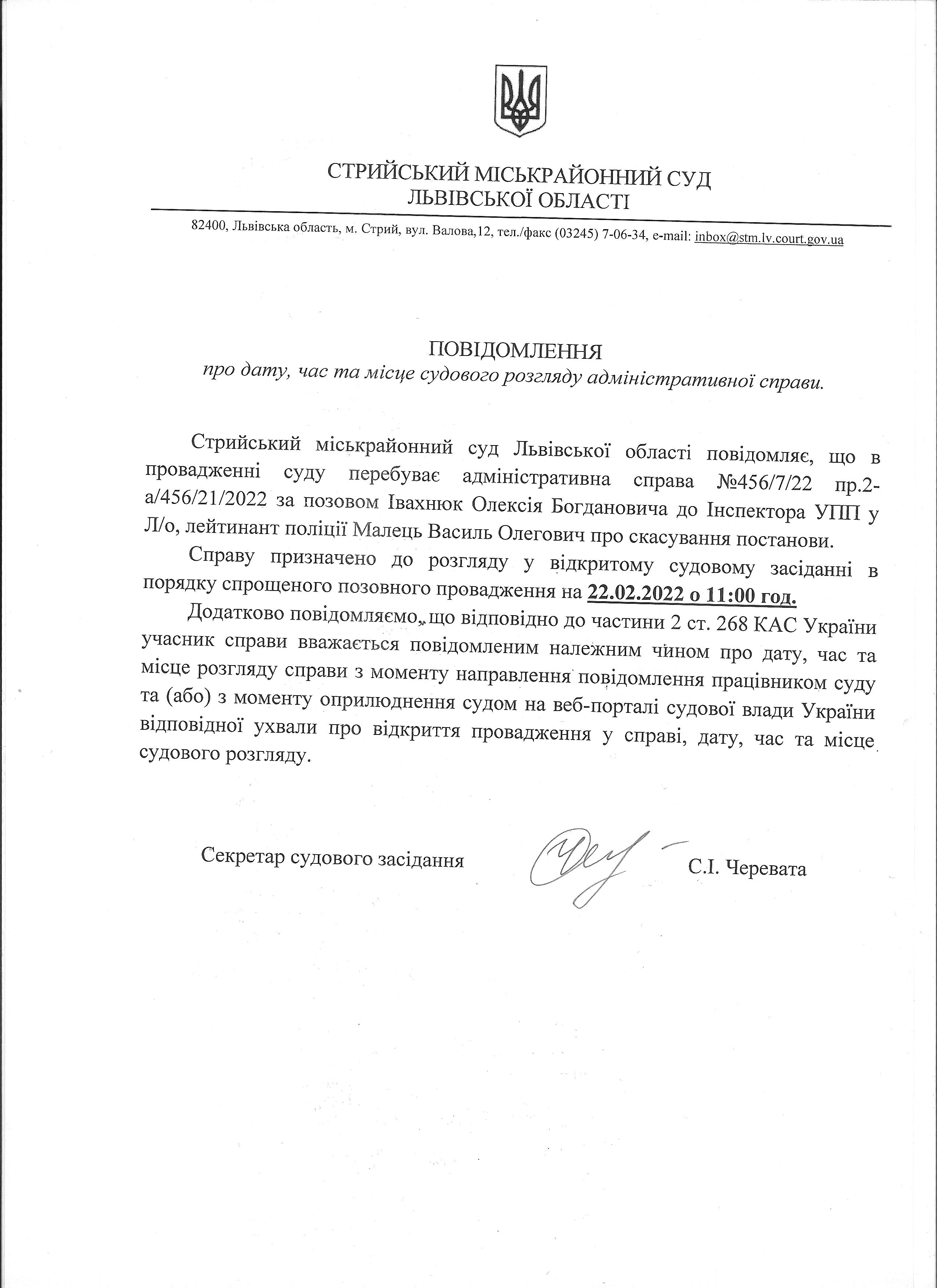 Повідомлення про дату, час та місце судового розгляду адміністративної справи