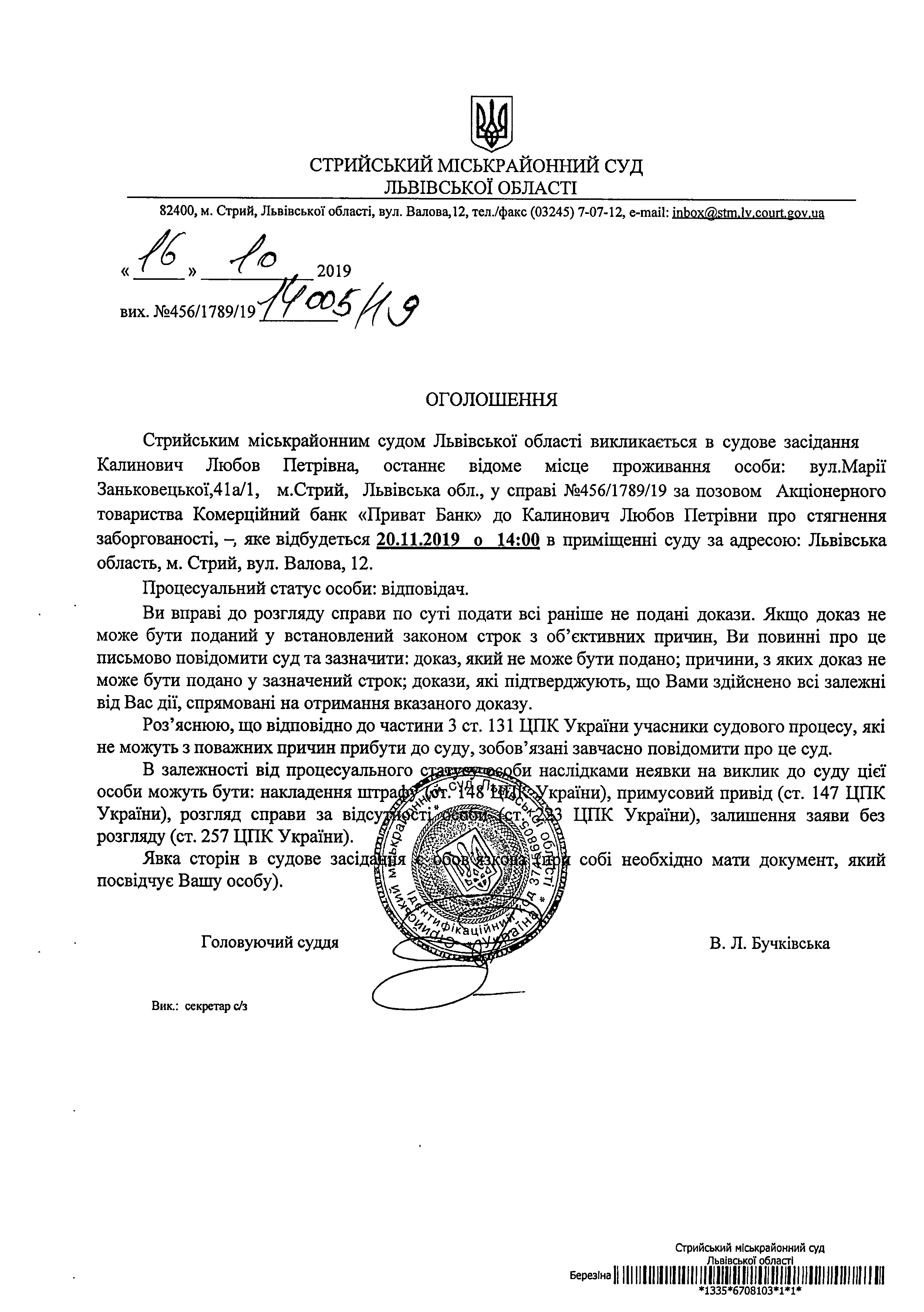 Про виклик Калинович Л.П.