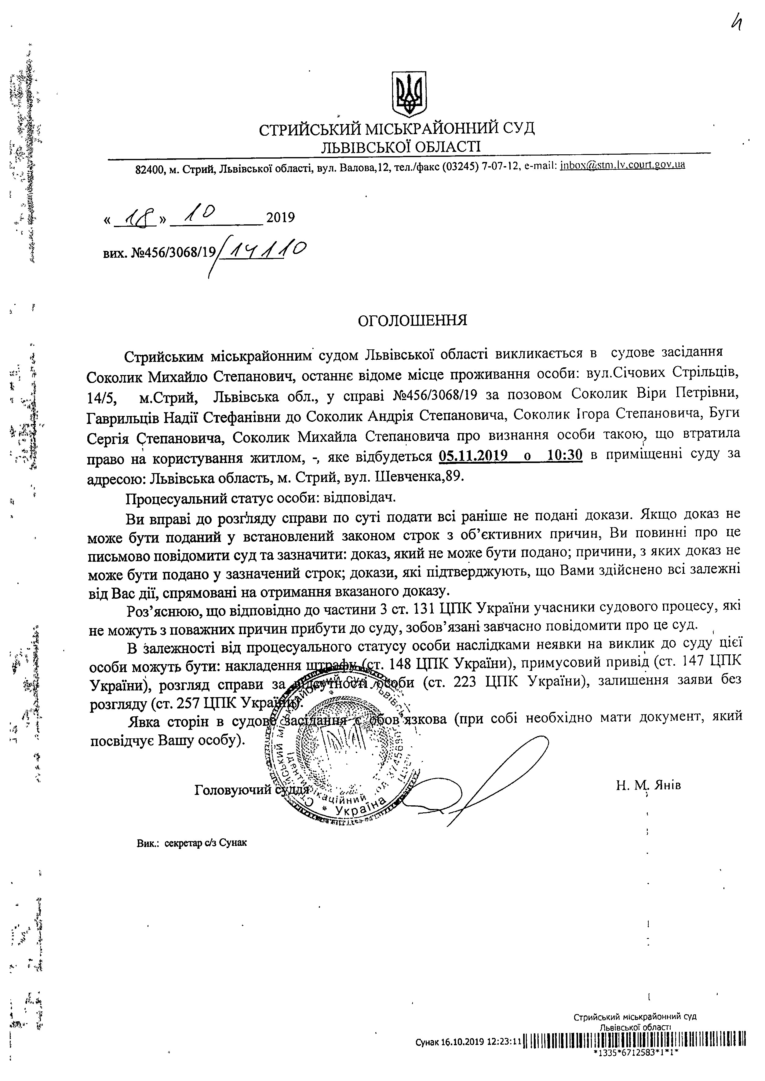 Про виклик Соколик М.С.