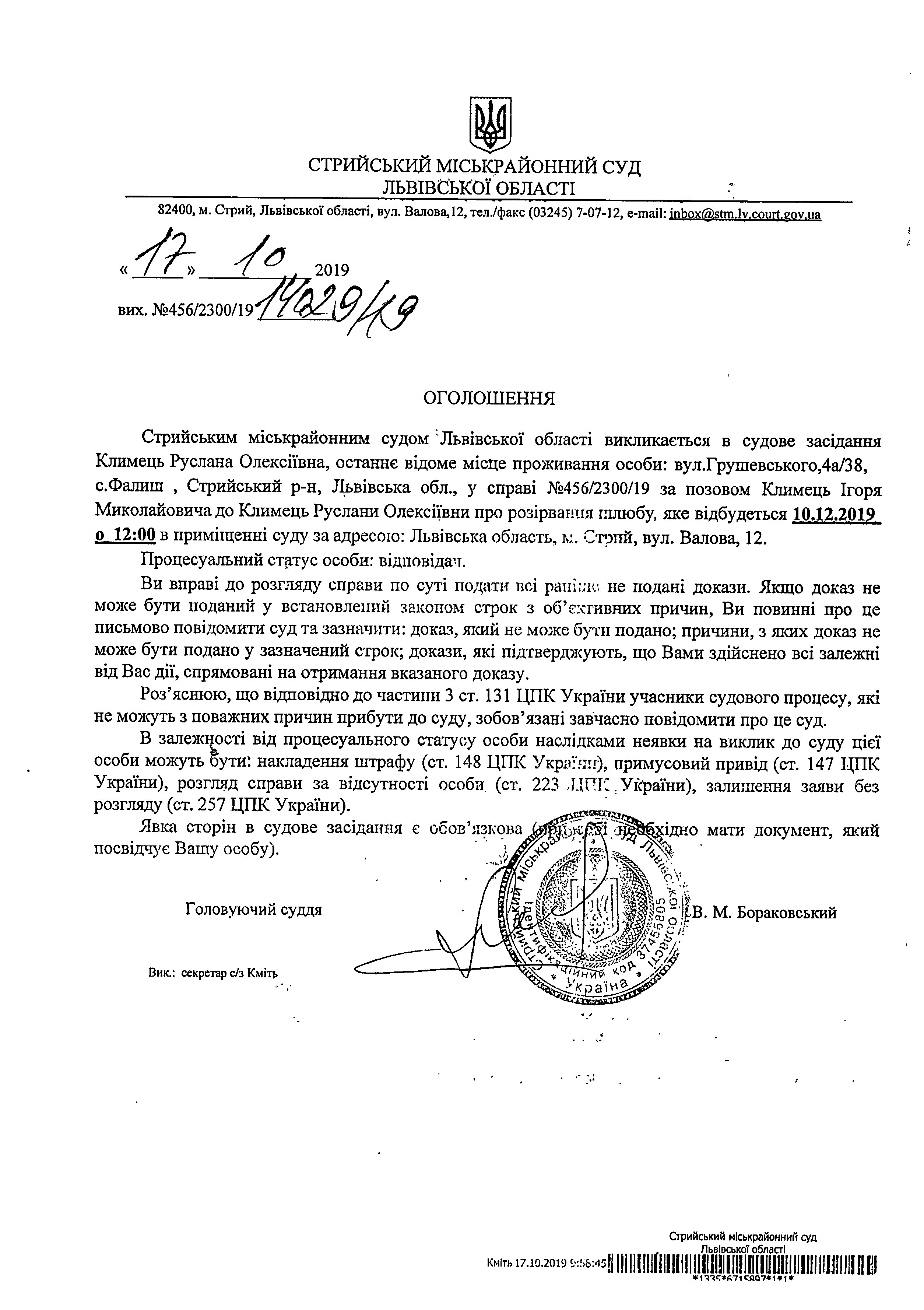 Про виклик Климець Р.О.