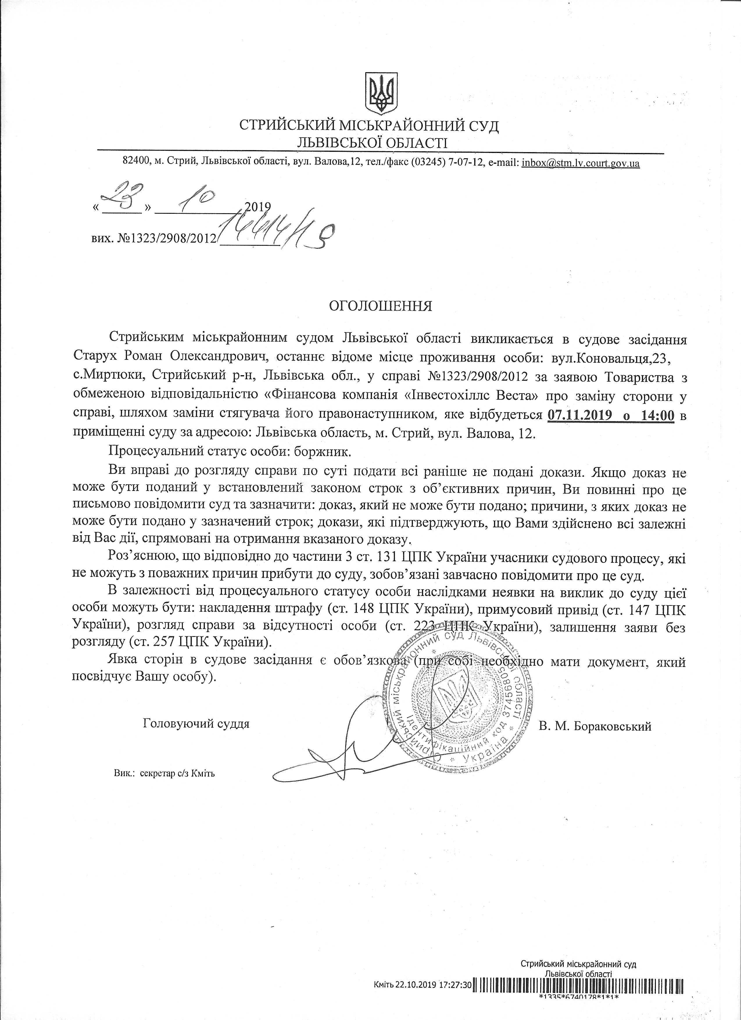 Про виклик Старух Р.О.