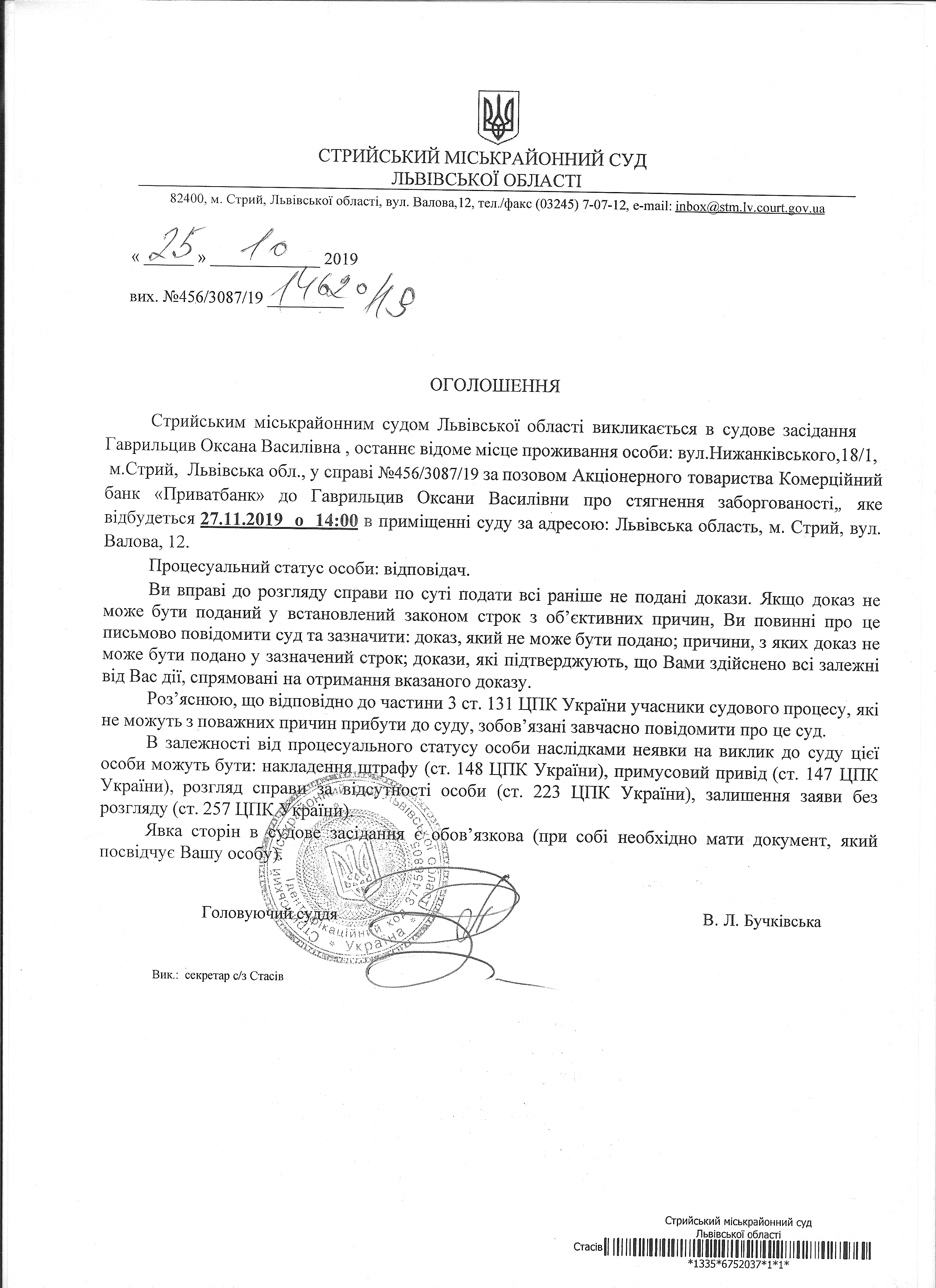 Про виклик Гаврильцив О.В.