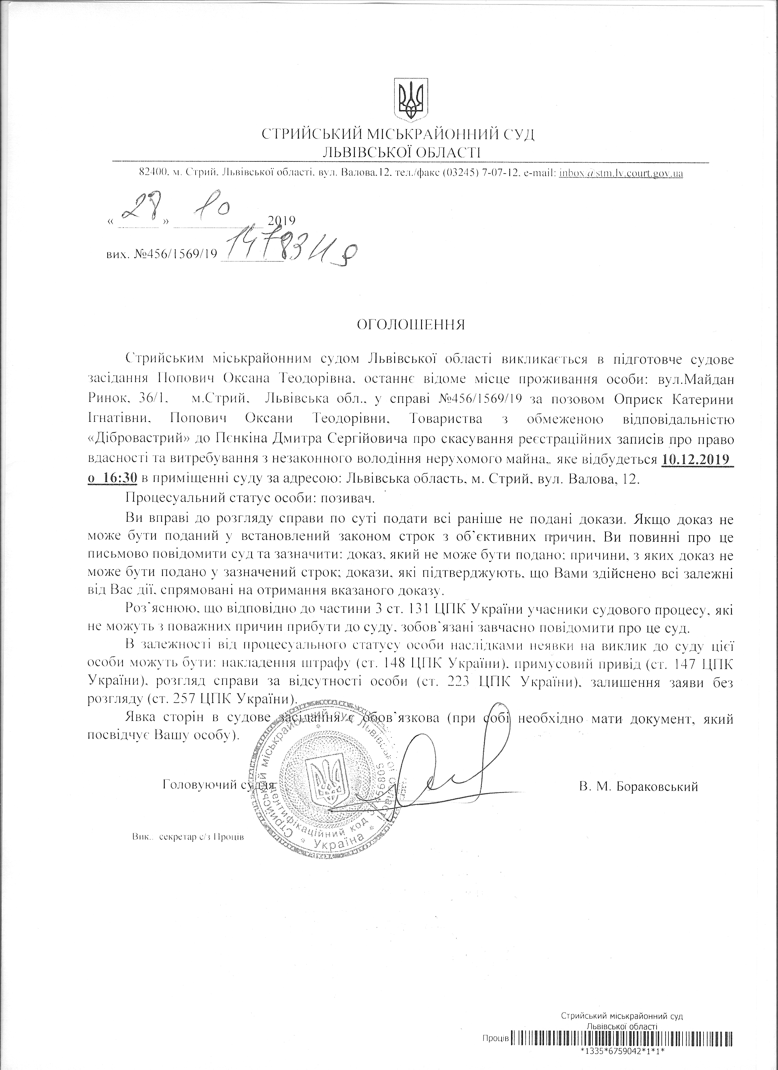 Про виклик Попович О.Т.