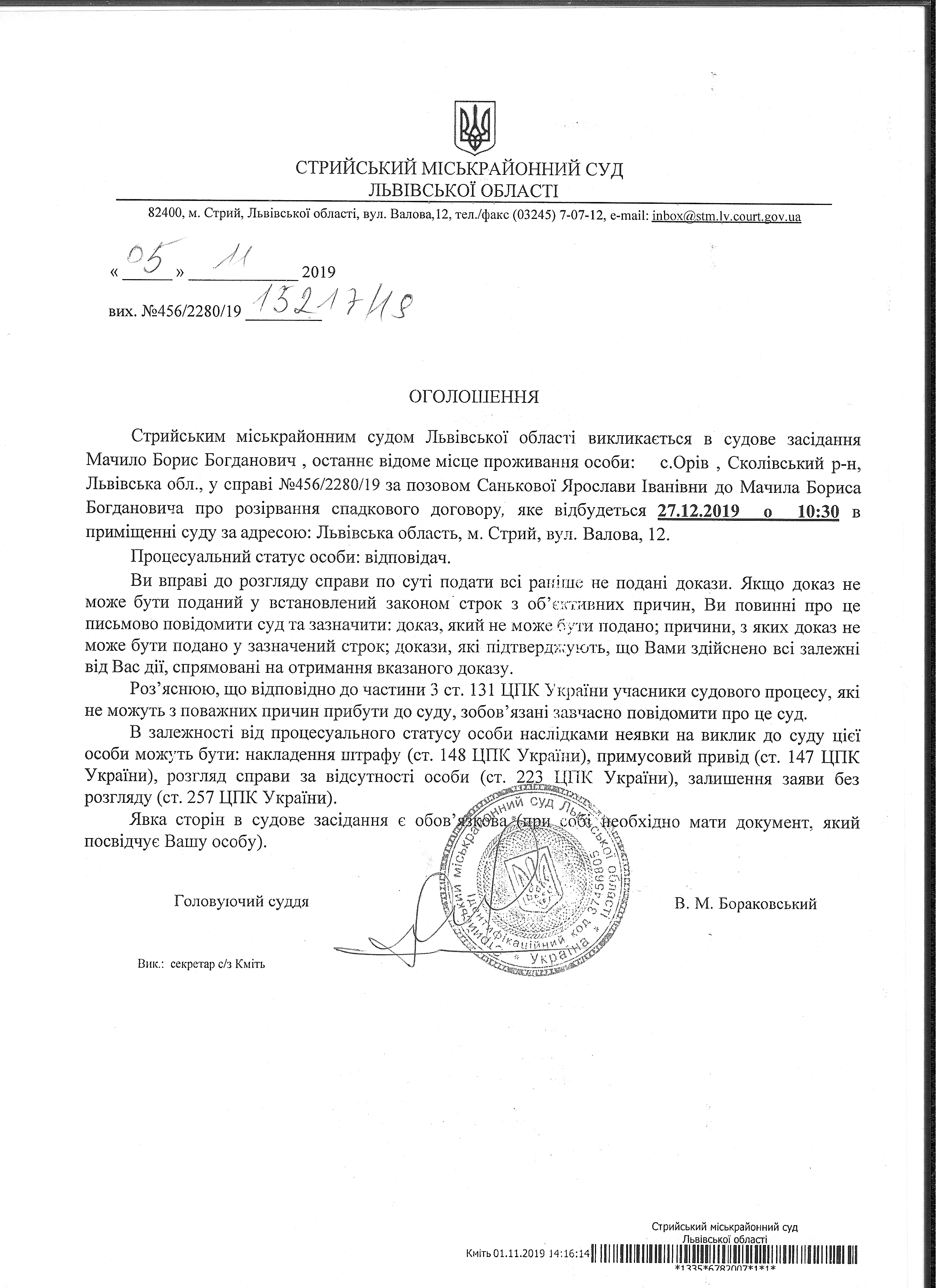 Про виклик Мачило Б.Б.