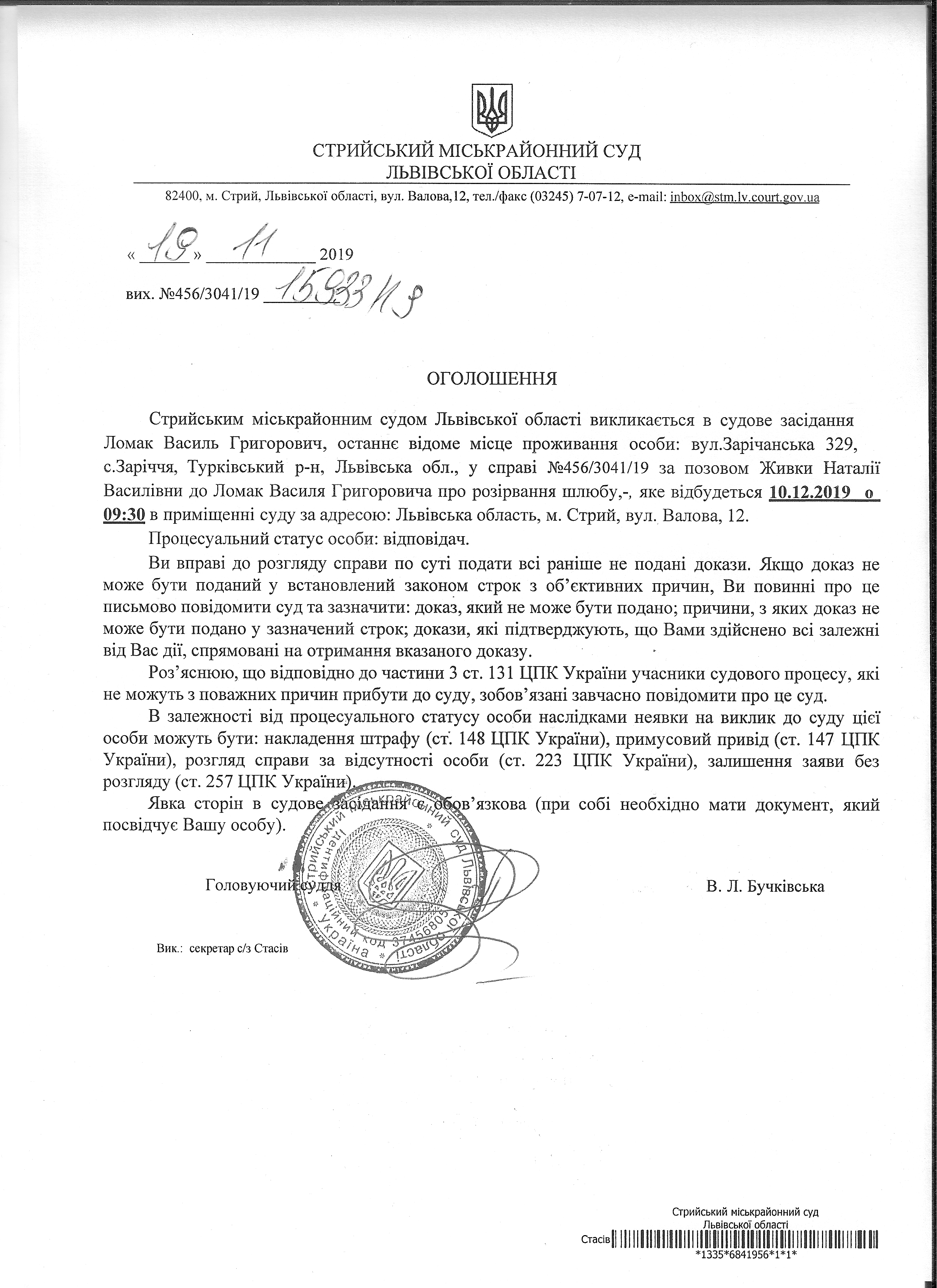 Про виклик Ломак В.Г.