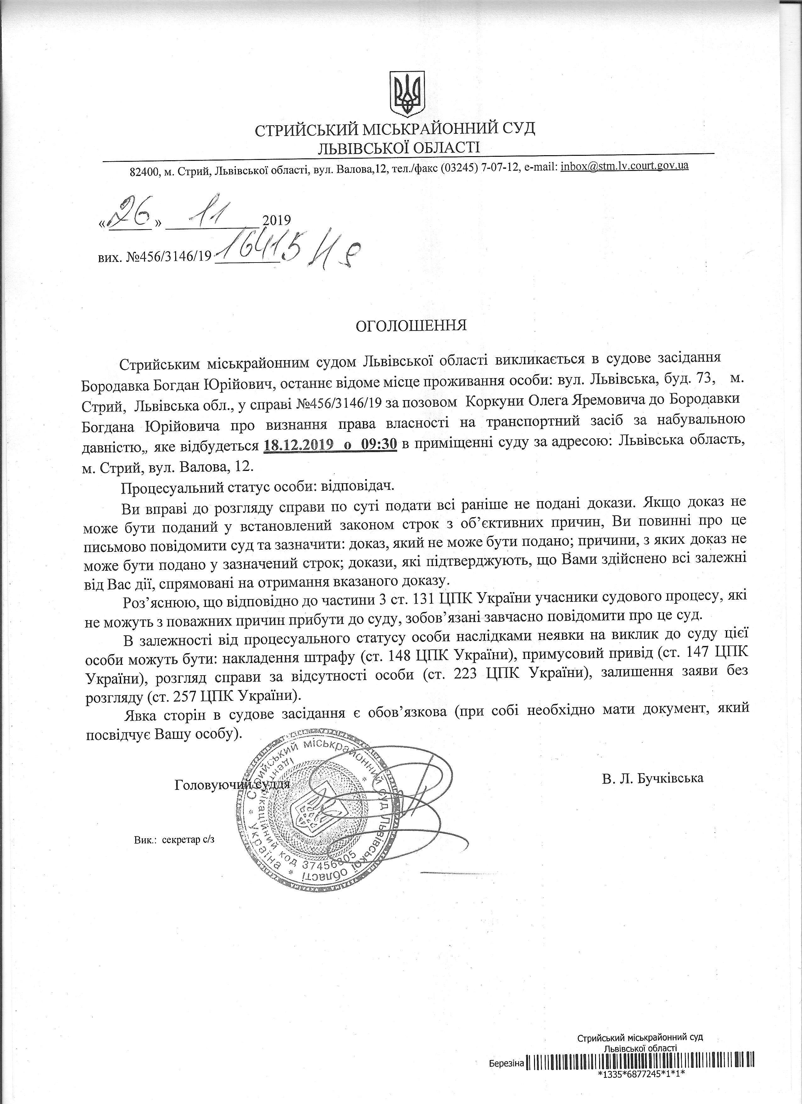 Про виклик Бородавка Б.Ю.
