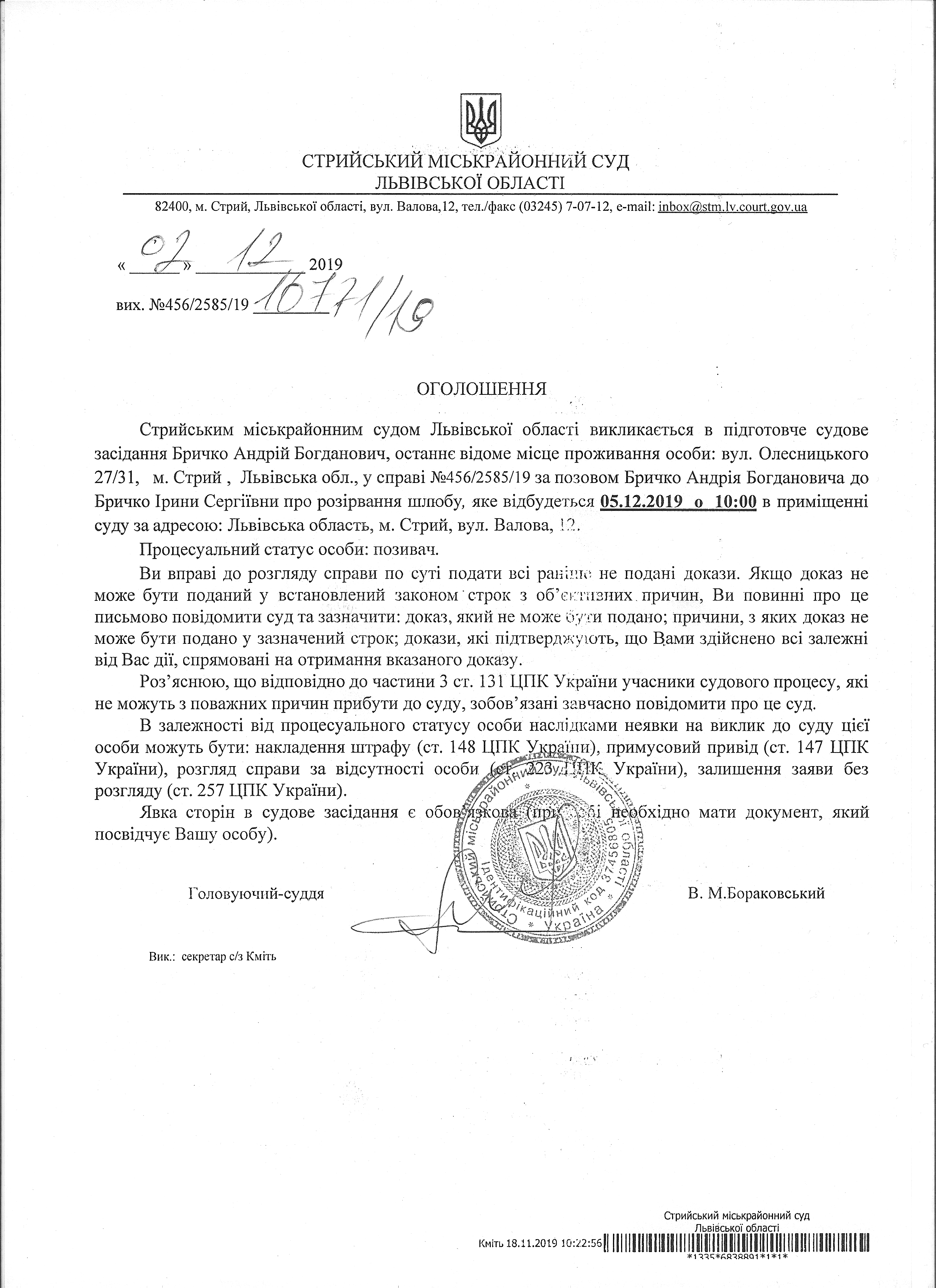 Про виклик Бричко А.Б.