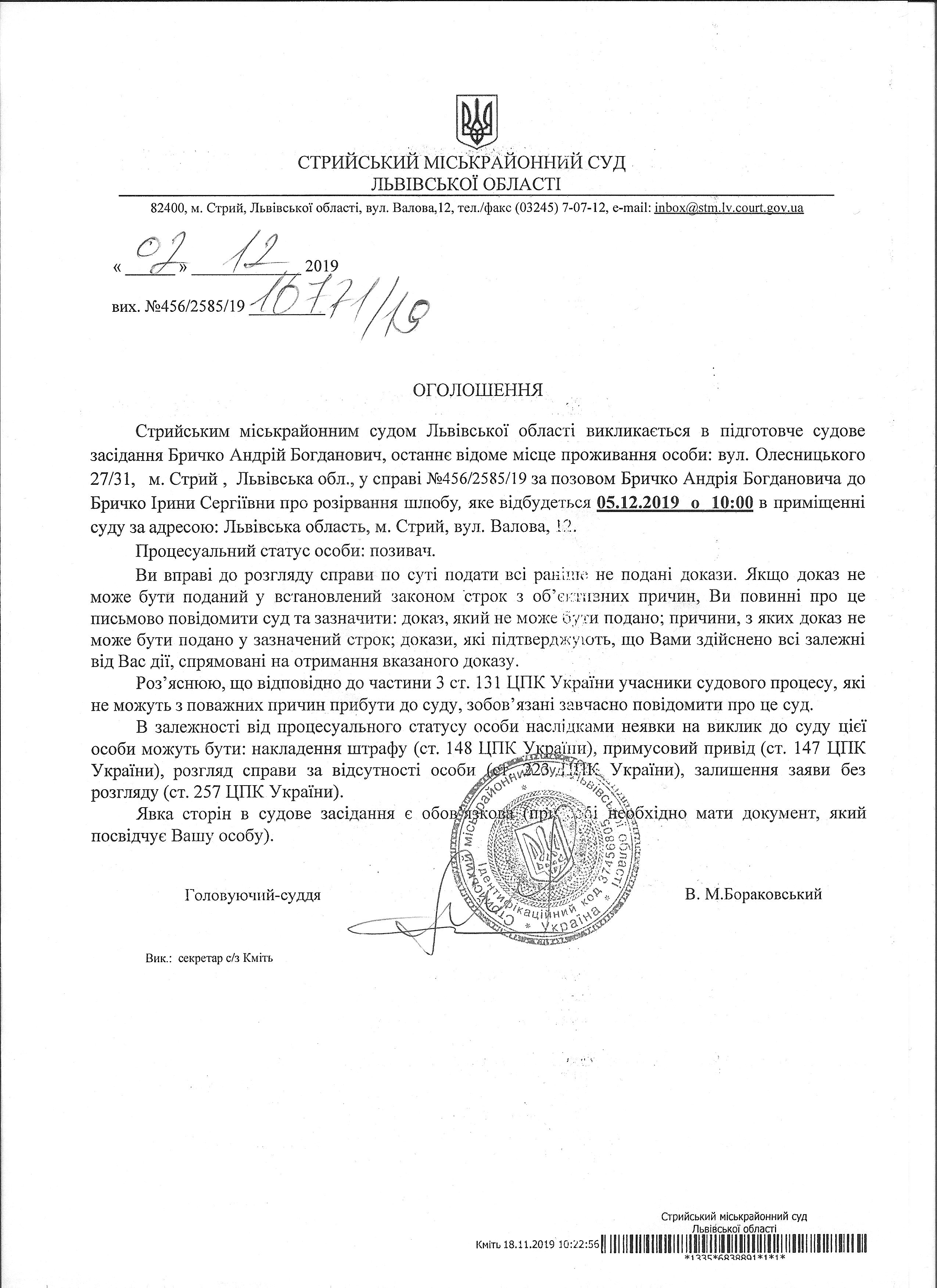 Про виклик Бричко А.Б.