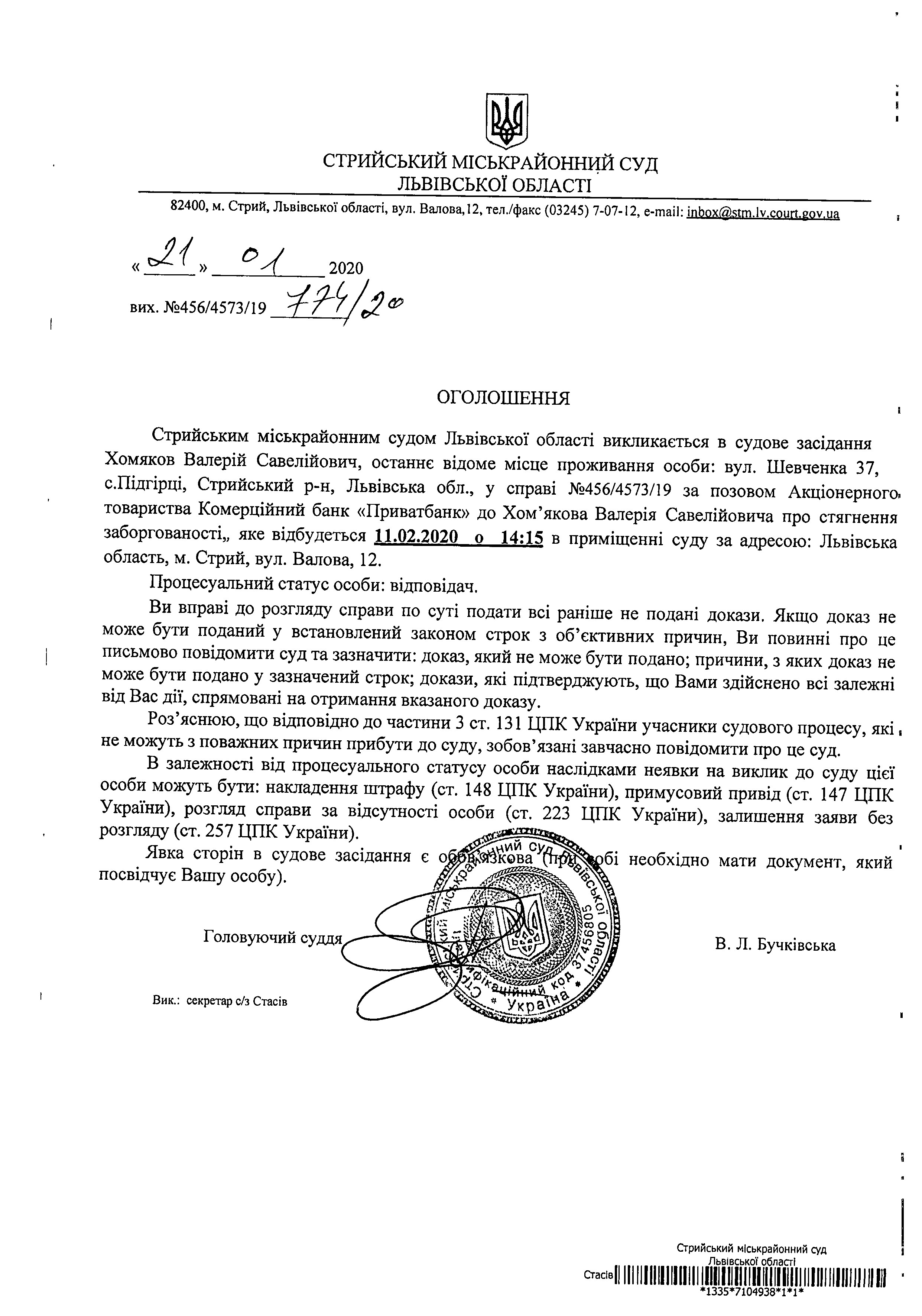Про виклик Хомякова В.С.