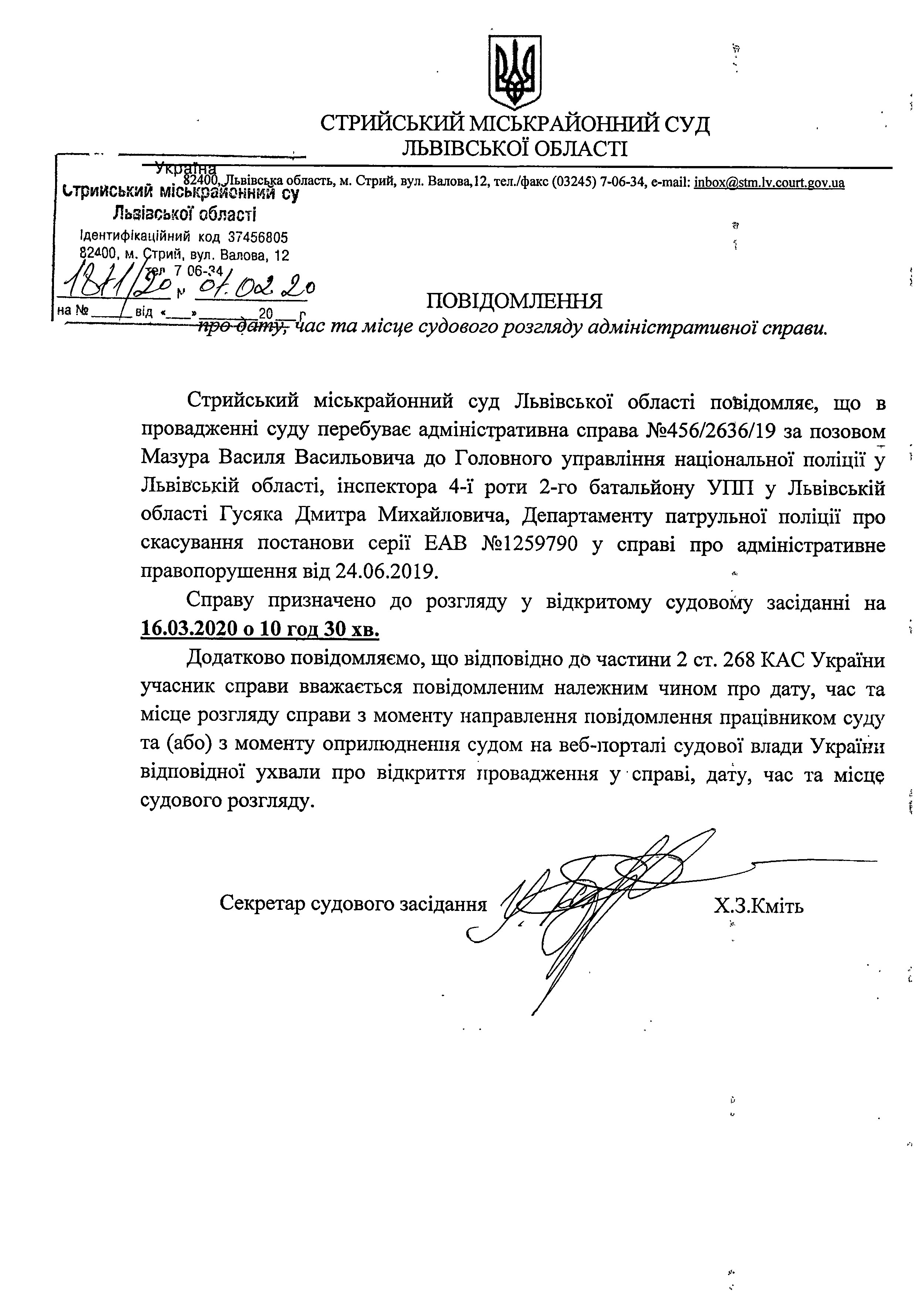 Повідомлення про дату, час та місце судового розгляду адміністративної справи