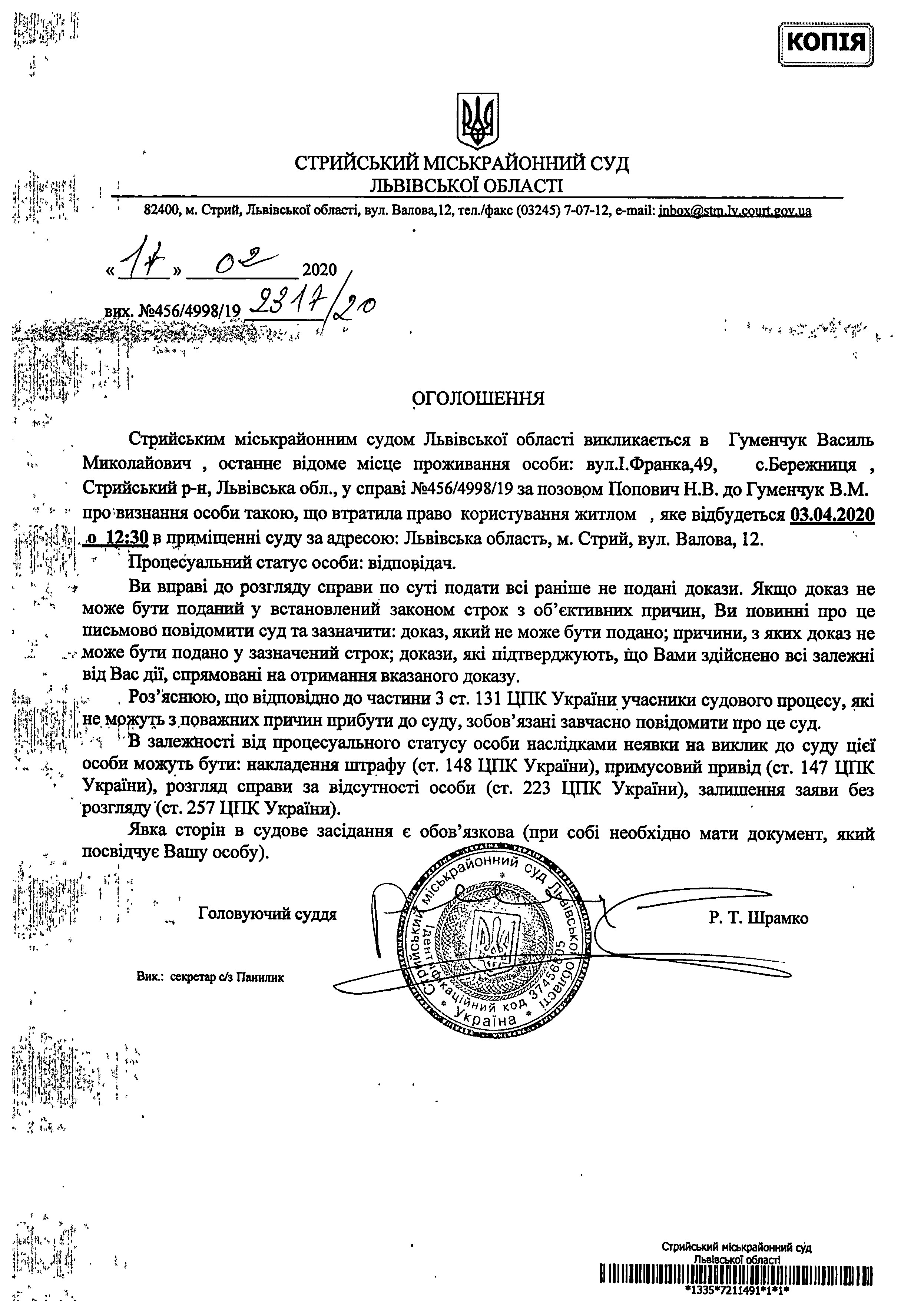 Про виклик Гуменчук В.М.