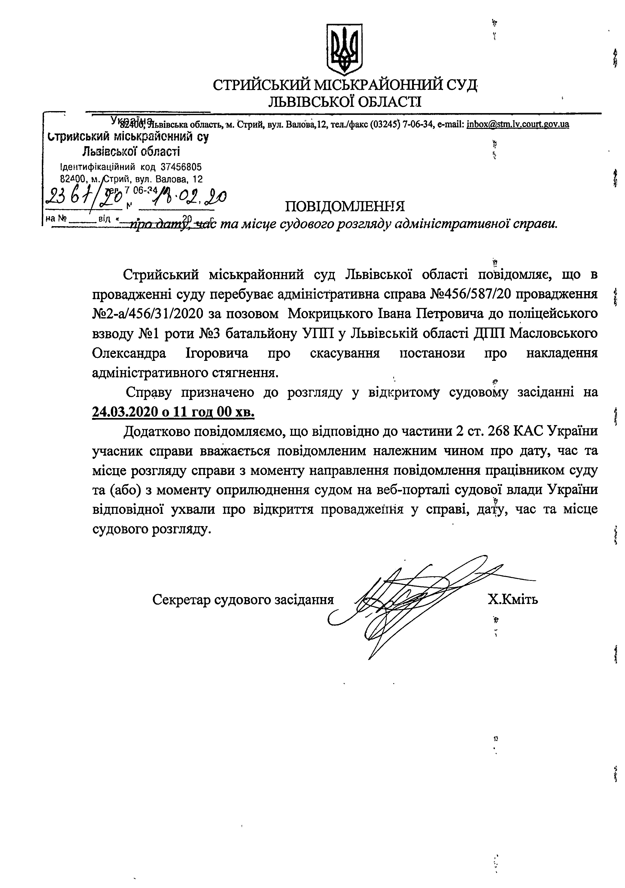 Повідомлення про дату, час та місце судового розгляду адміністративної справи