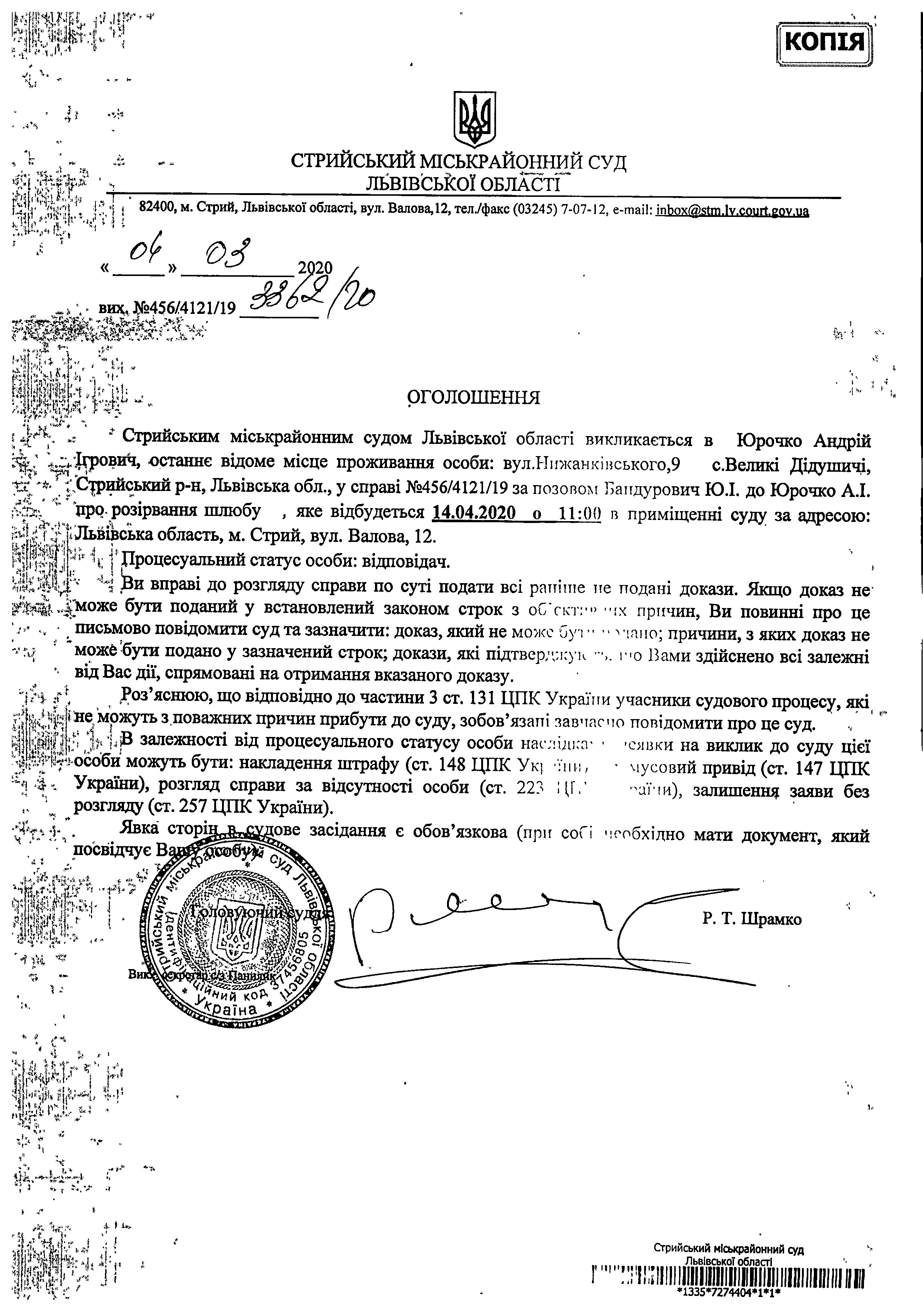 Про виклик Юрочко А.І.