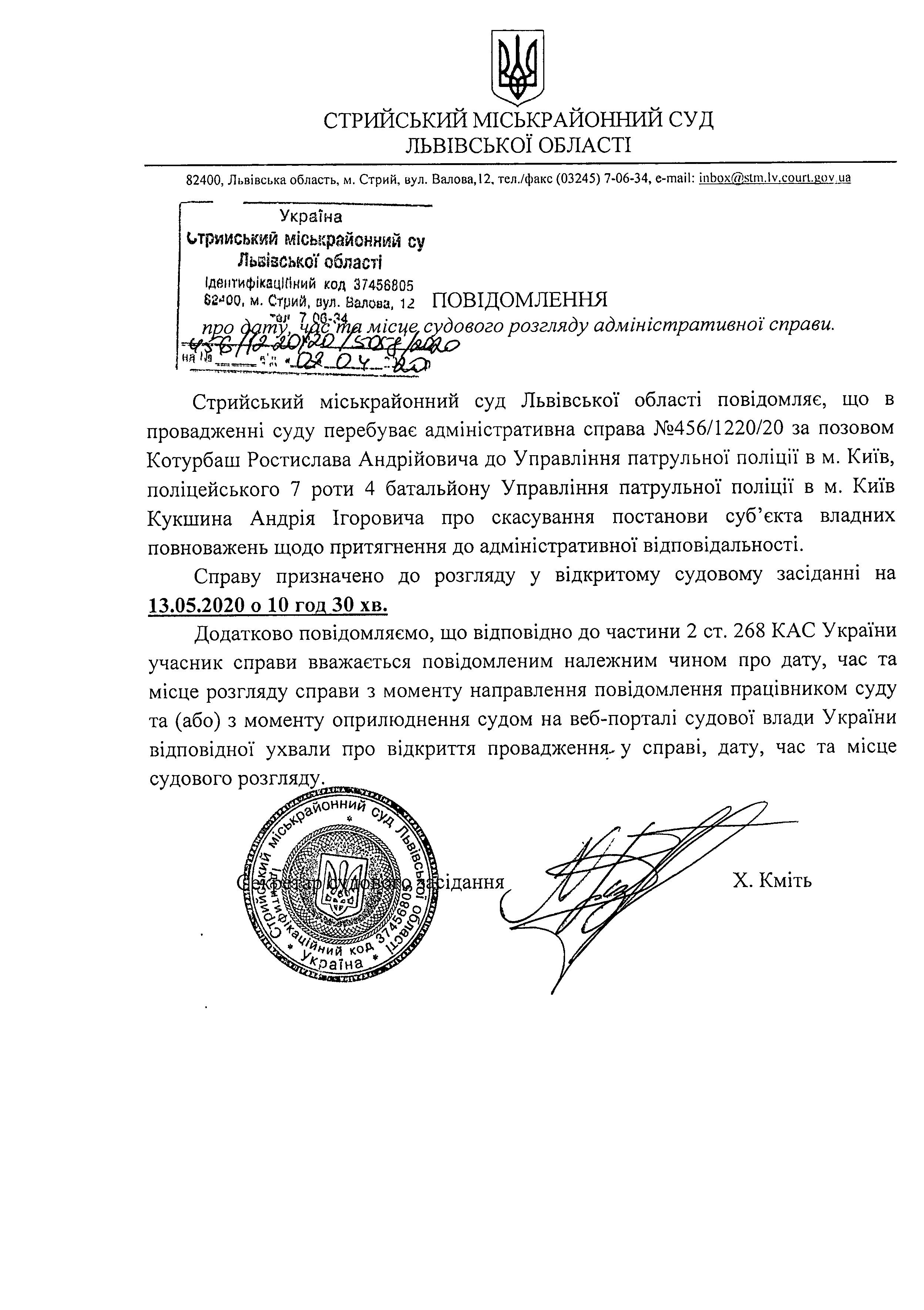 Повідомлення про дату, час та місце судового розгляду адміністративної справи