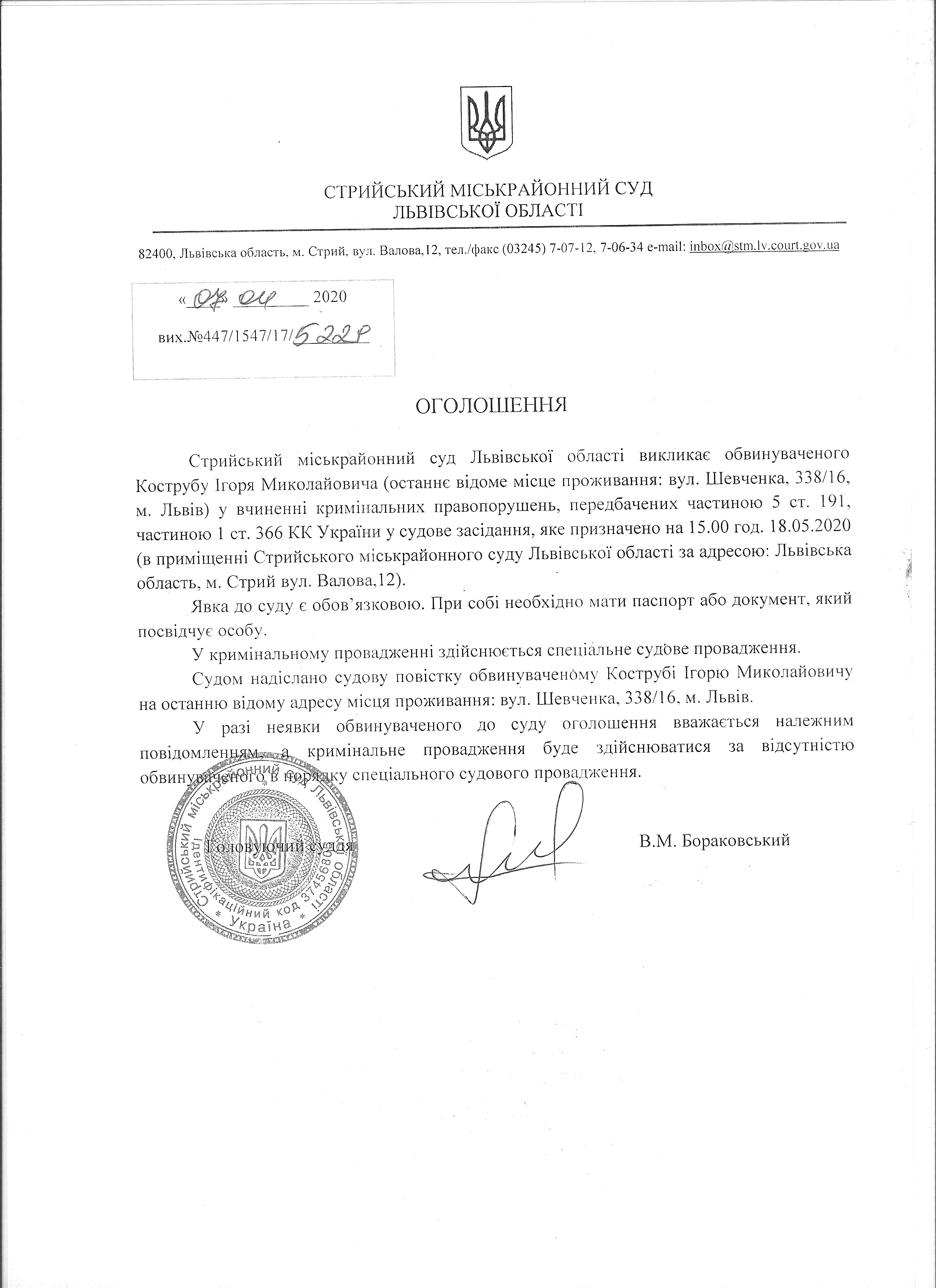 Про виклик Коструби І.М.