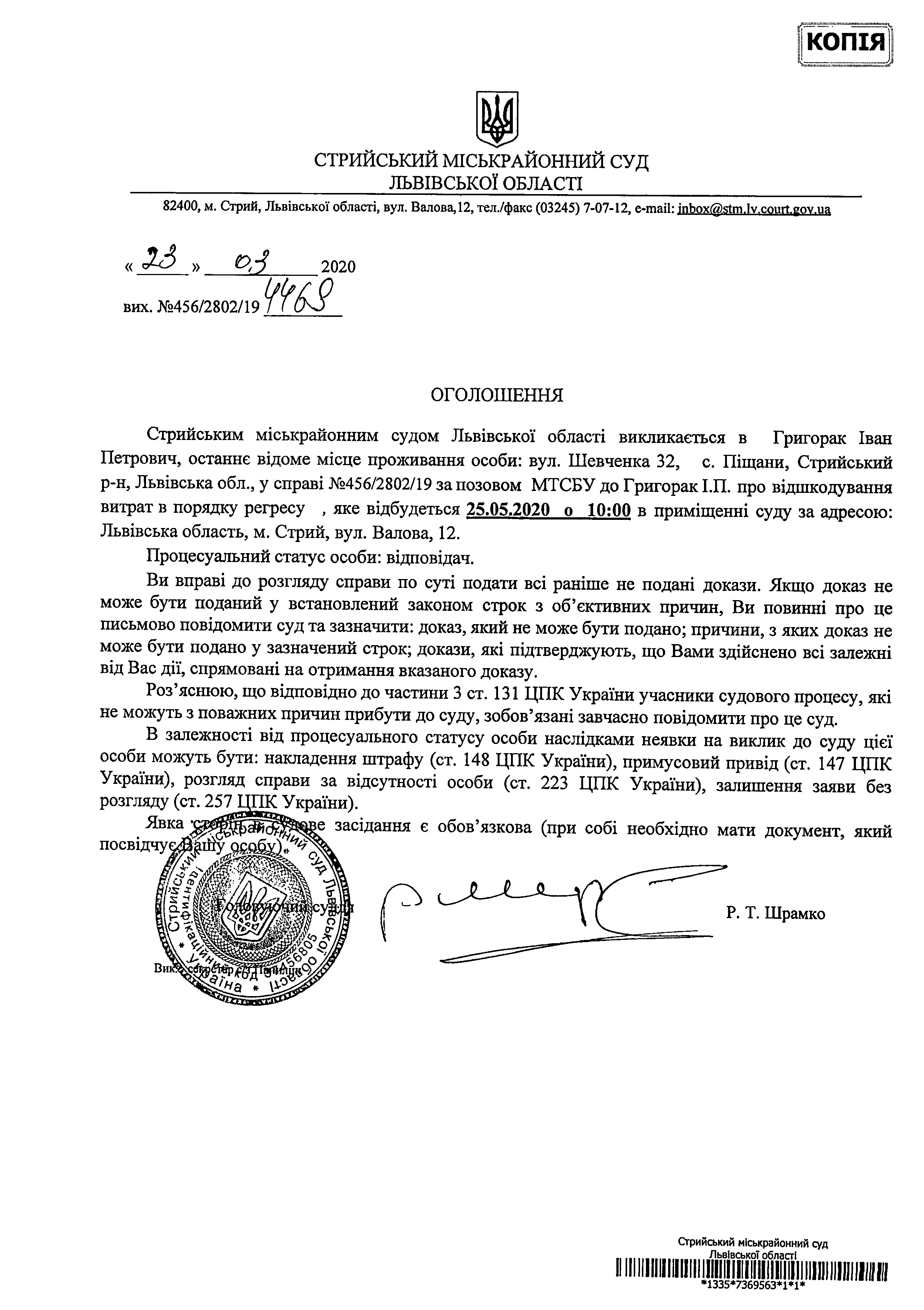 Про виклик Григорак І.П.
