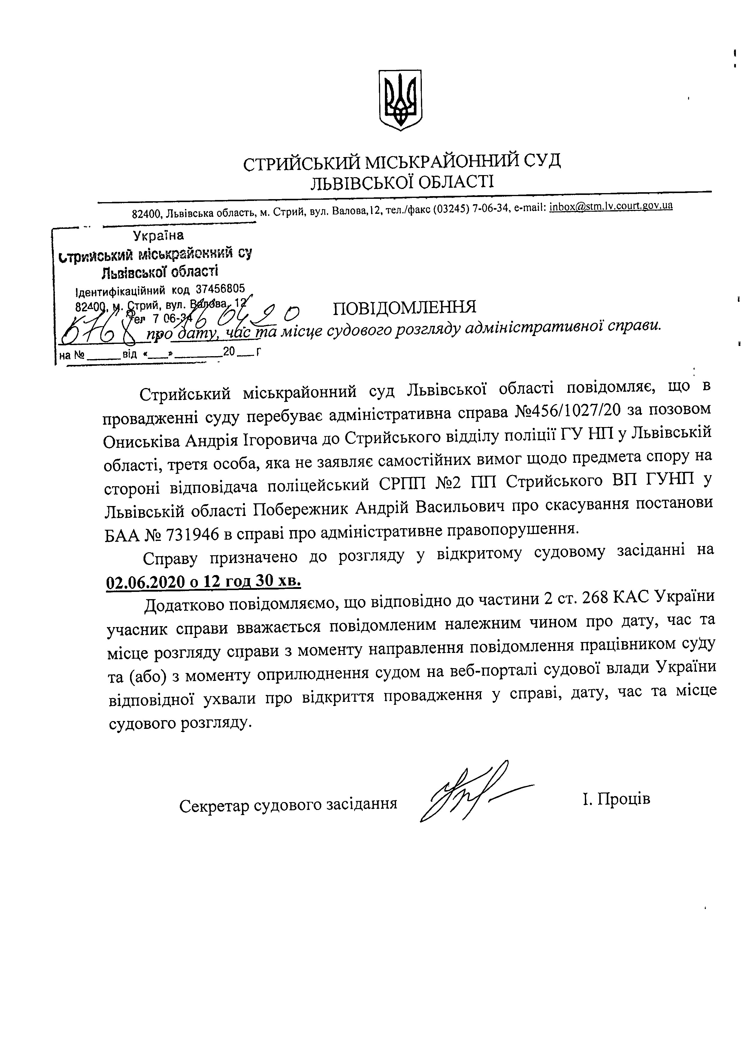 Повідомлення про дату, час та місце судового розгляду адміністративної справи