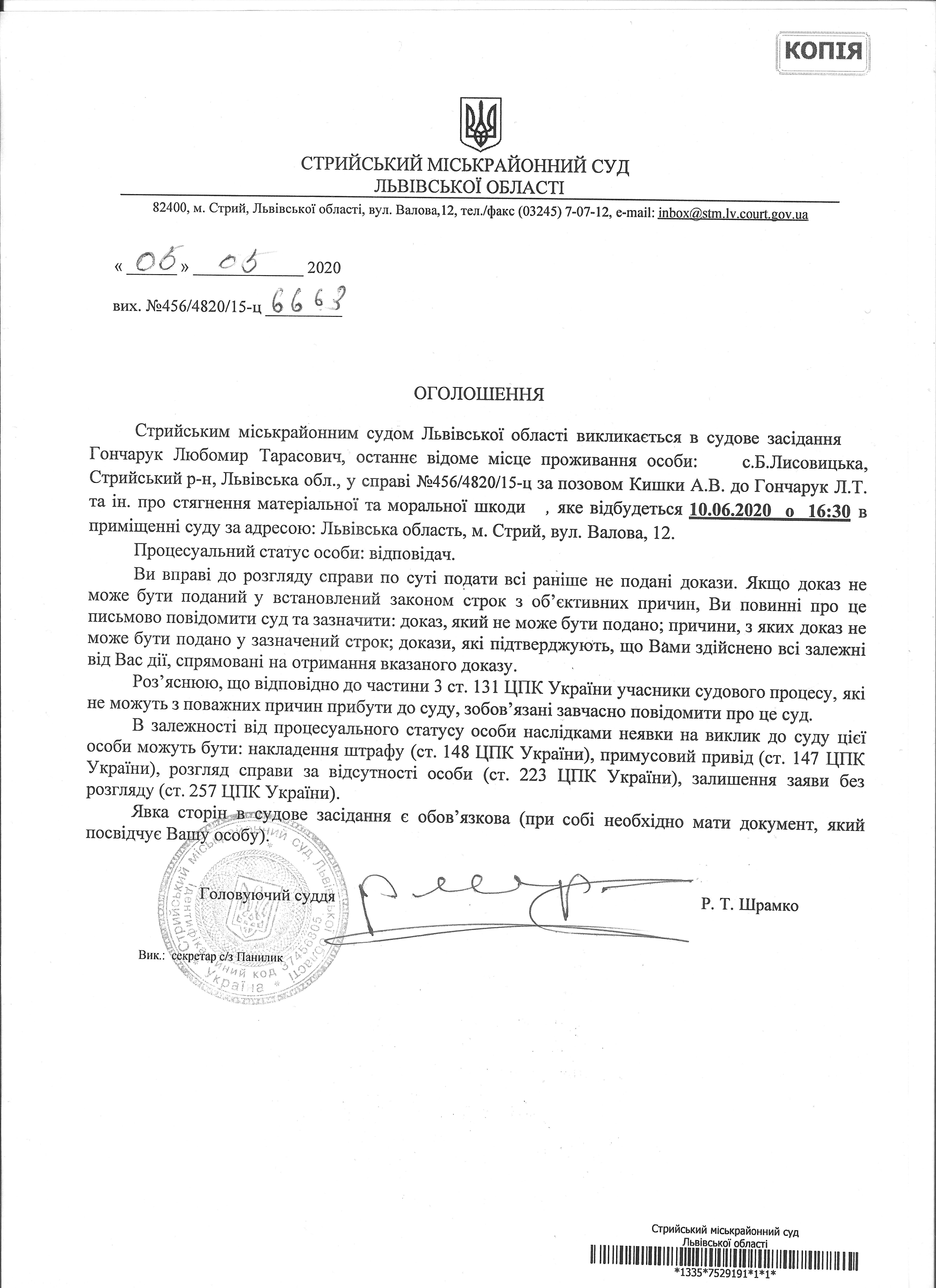 Про виклик Гончарук Л.Т.