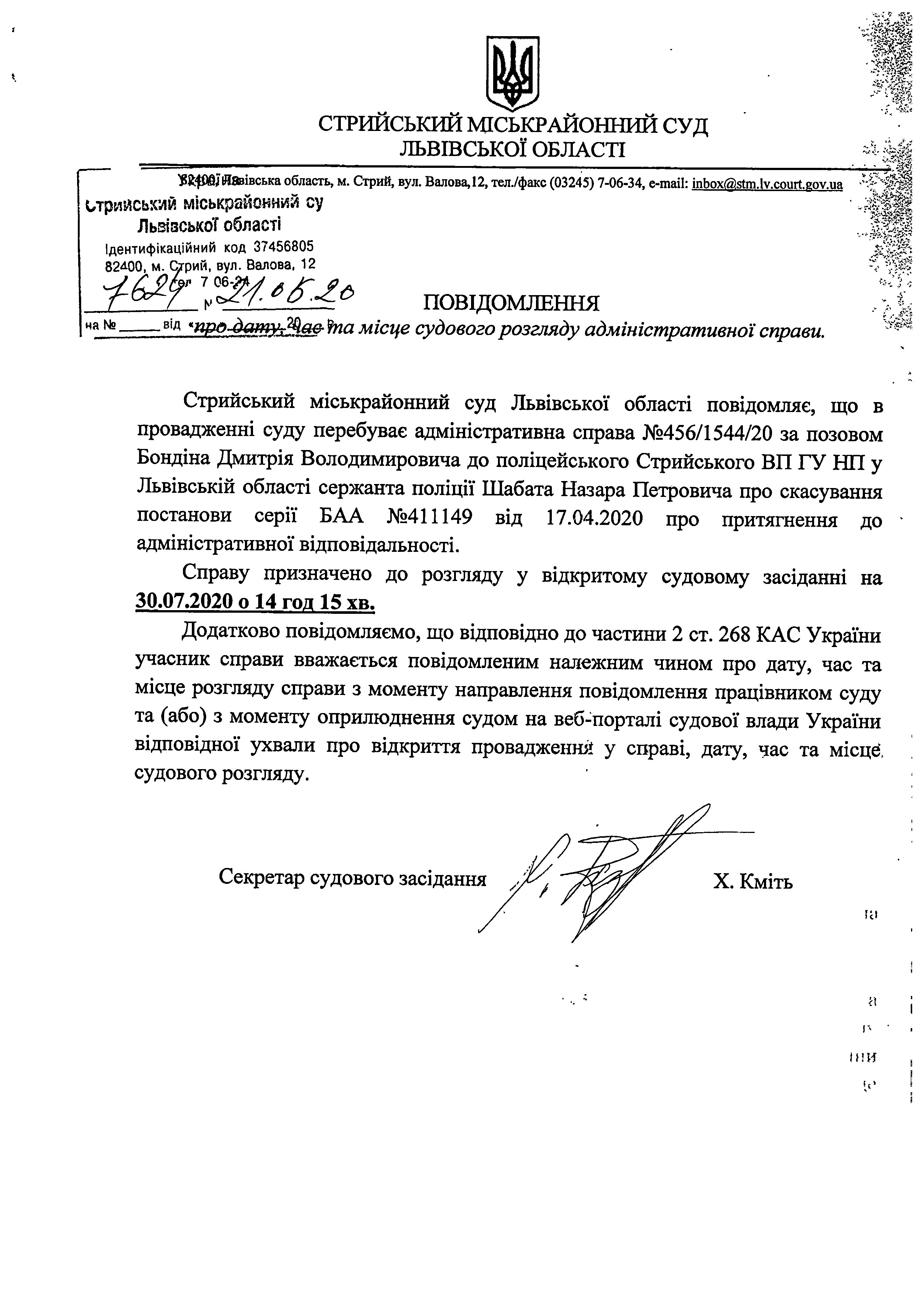 Повідомлення про дату, час та місце судового розгляду адміністративної справи