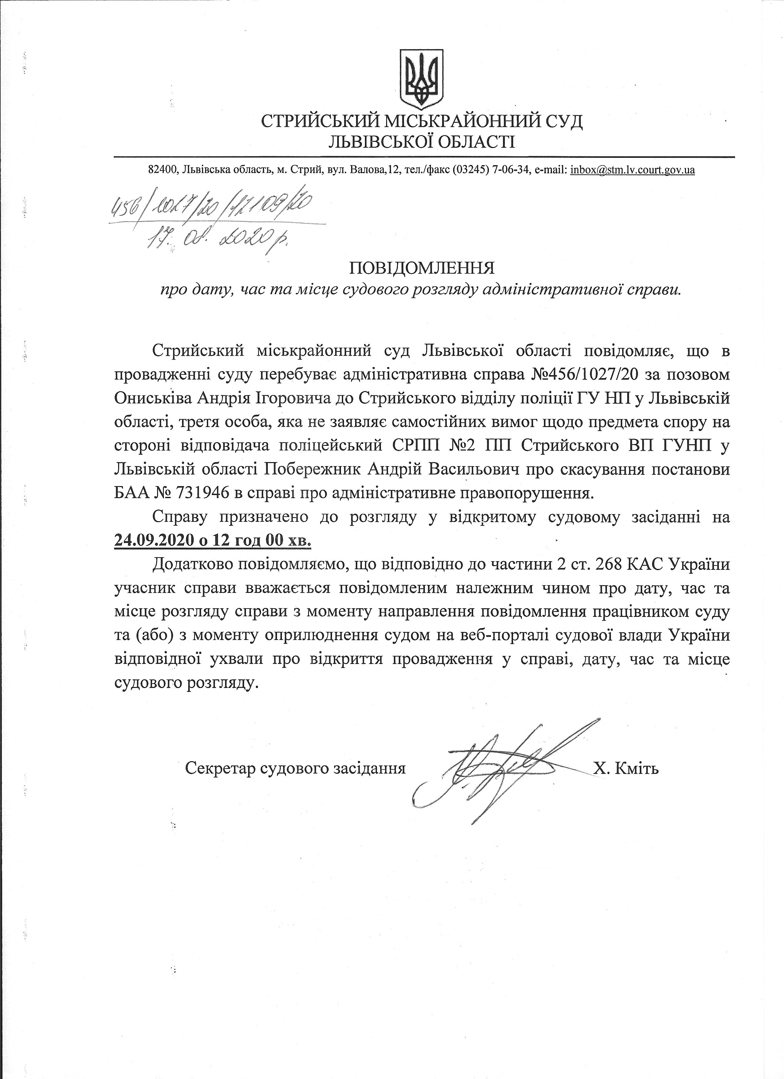 Повідомлення про дату, час та місце судового розгляду адміністративної справи