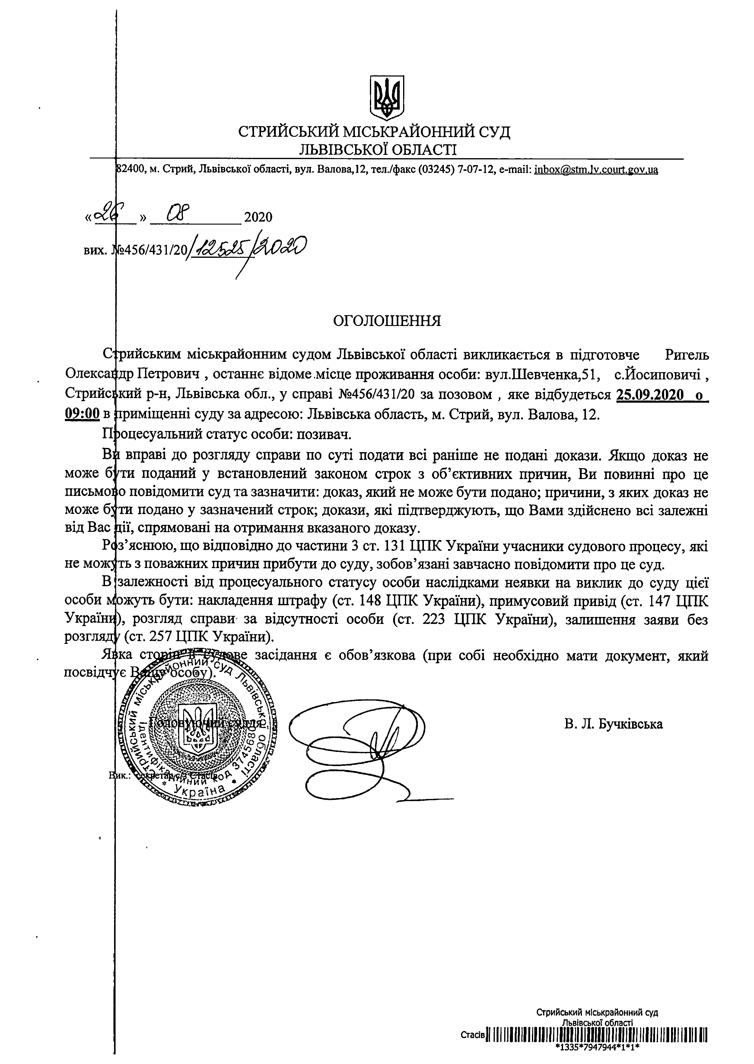 Про виклик Ригель О.П.